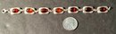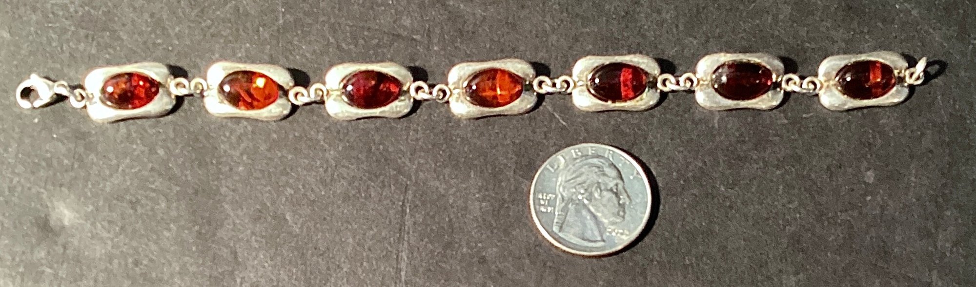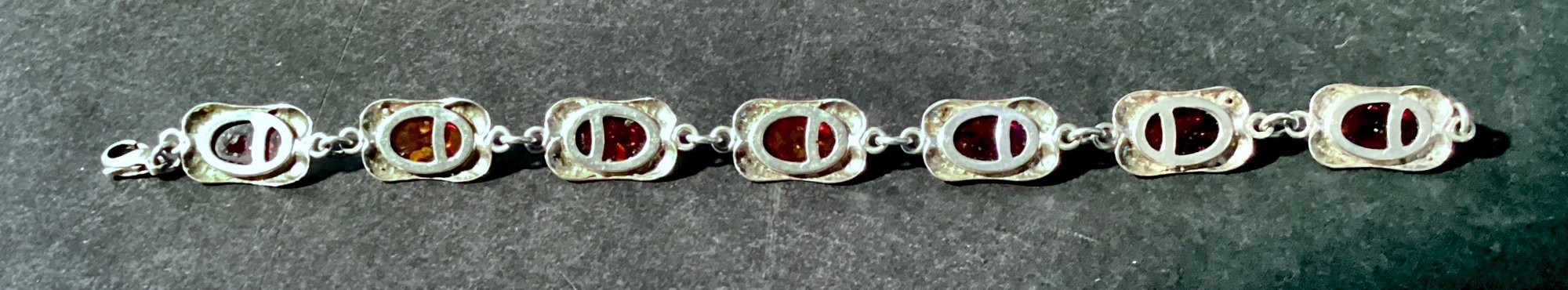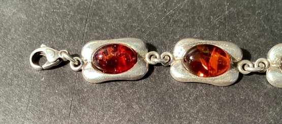 A sterling silver 7 link bracelet with oval amber beads set in rectangular silver and connected with jump rings.