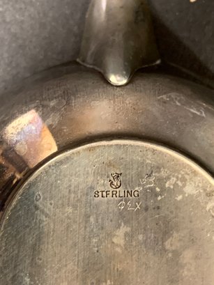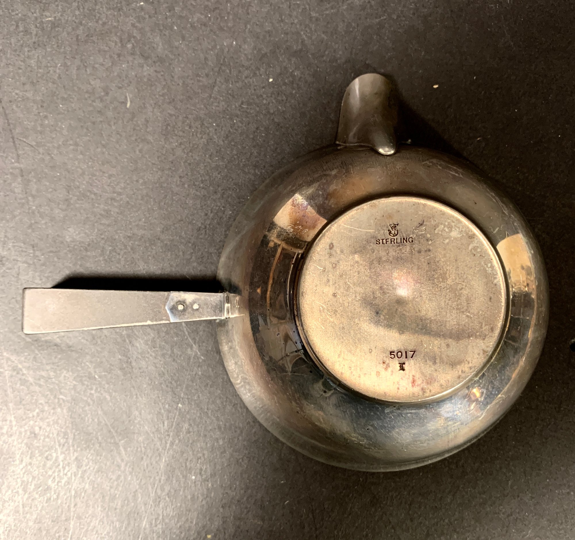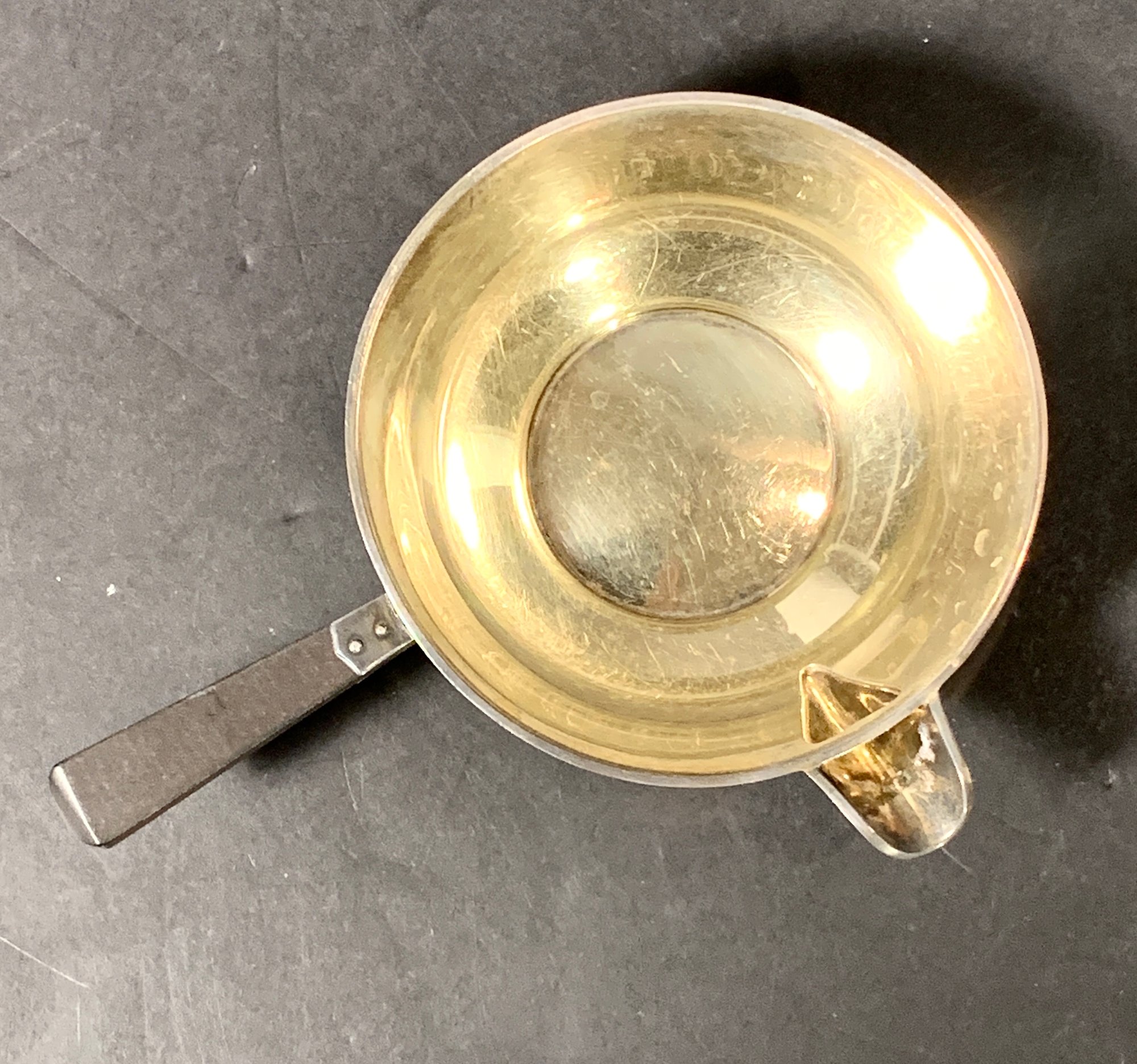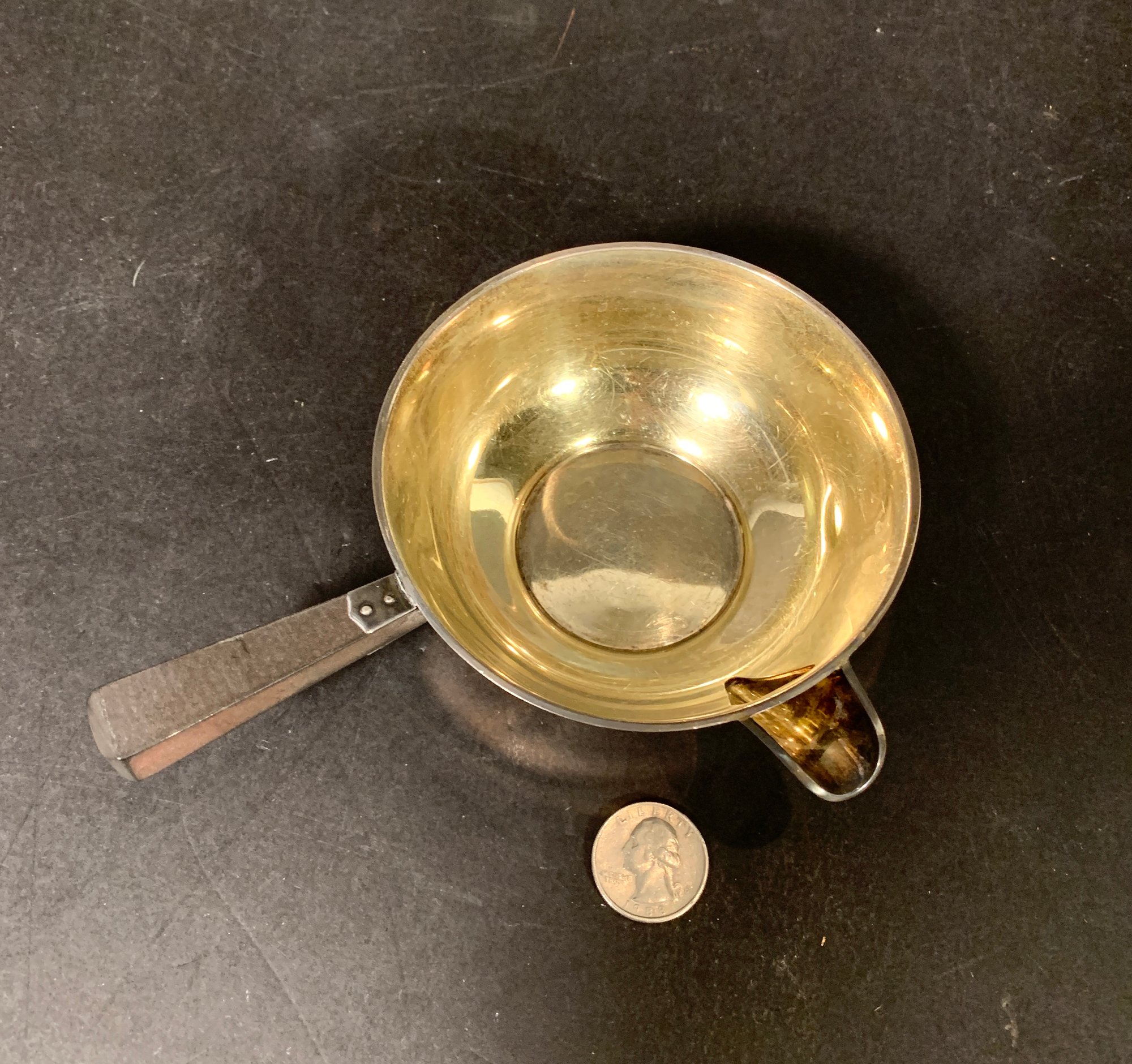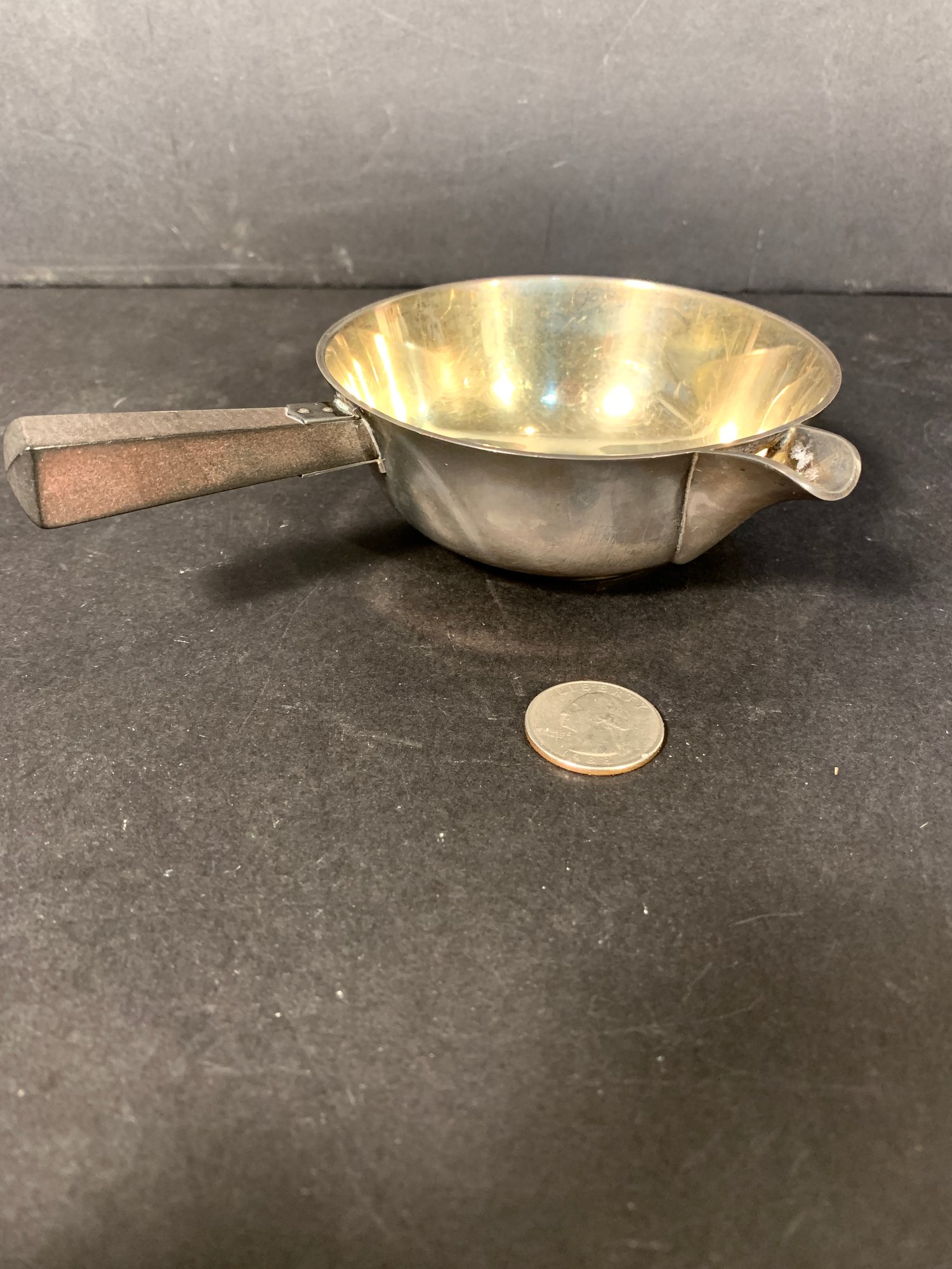 Very unusual sterling silver brandy warmer with an ebonized wood handle.