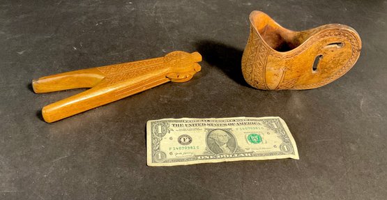 Here we have two very nice hand carved Scandinavian wooden items. One is a wedding cup. The other is a nutcracker. Very elaborate made out of dense European walnut. Very nice condition.