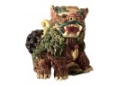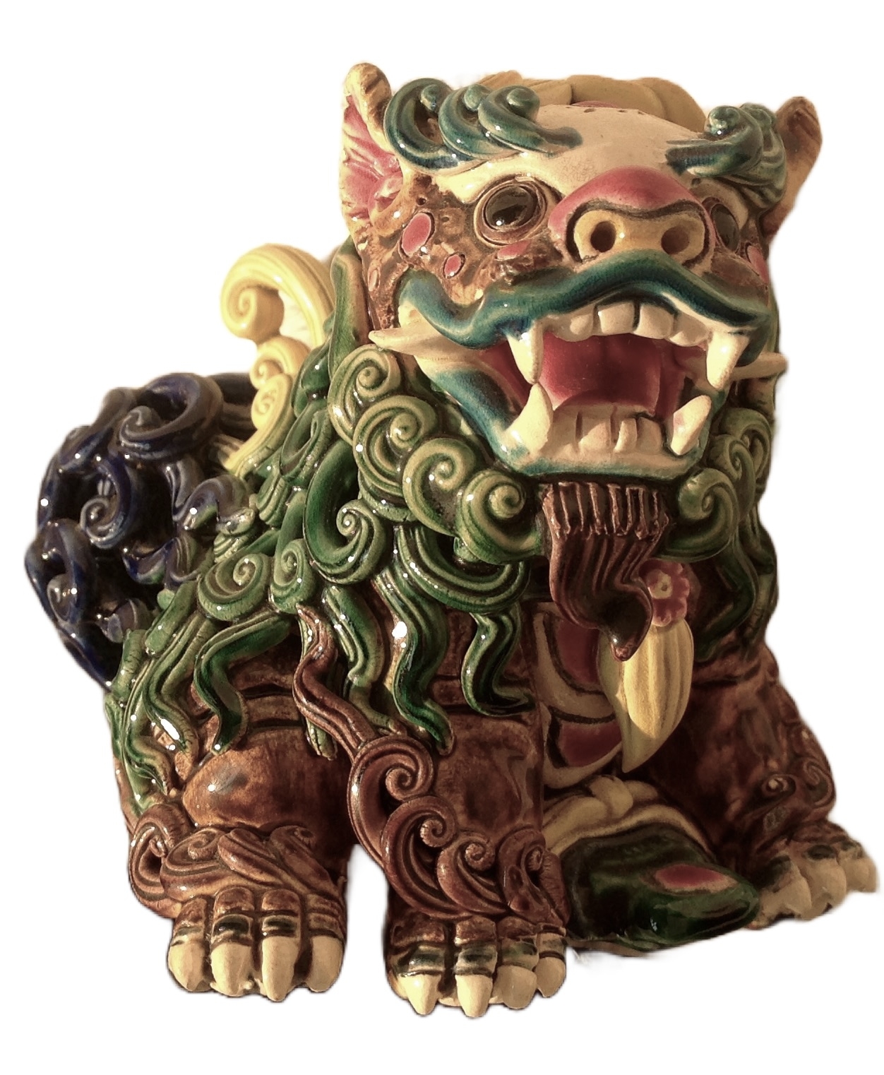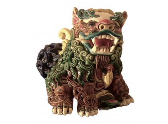 Sublime Asian guard dog in perfect condition. Glazed in vibrant colors of teal, yellow, green, brown, rose, and blue.