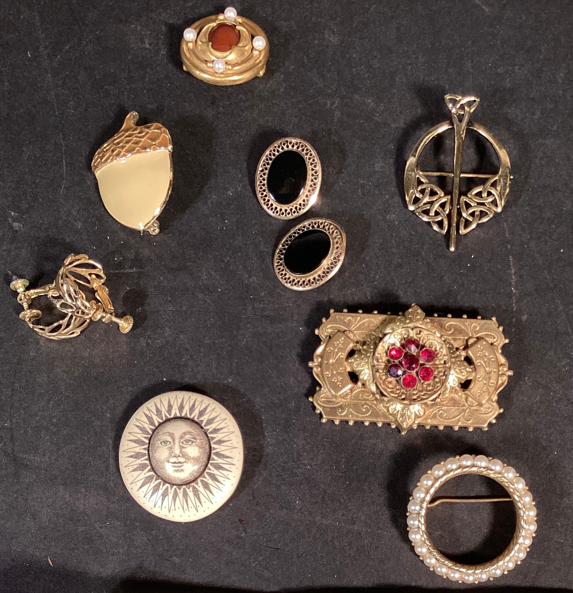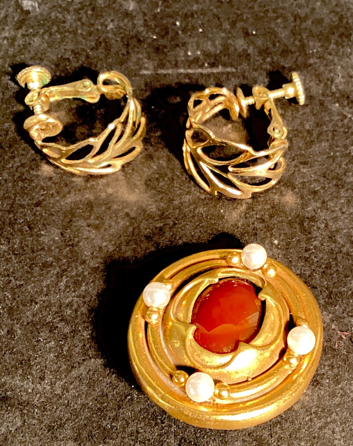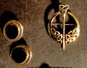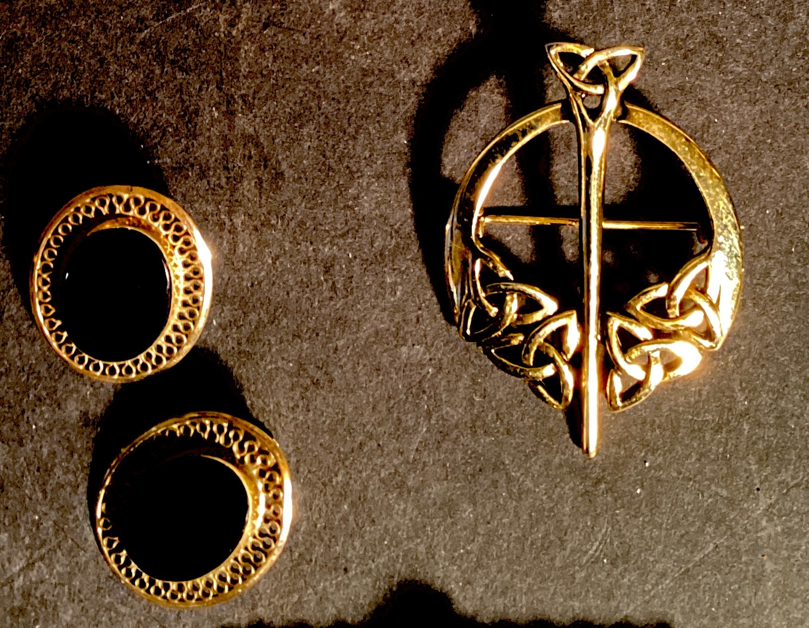 * a Gaelic brooch and gold and faux onyx screw back earrings. Both pieces are in very good condition, and appears to have never been worn.