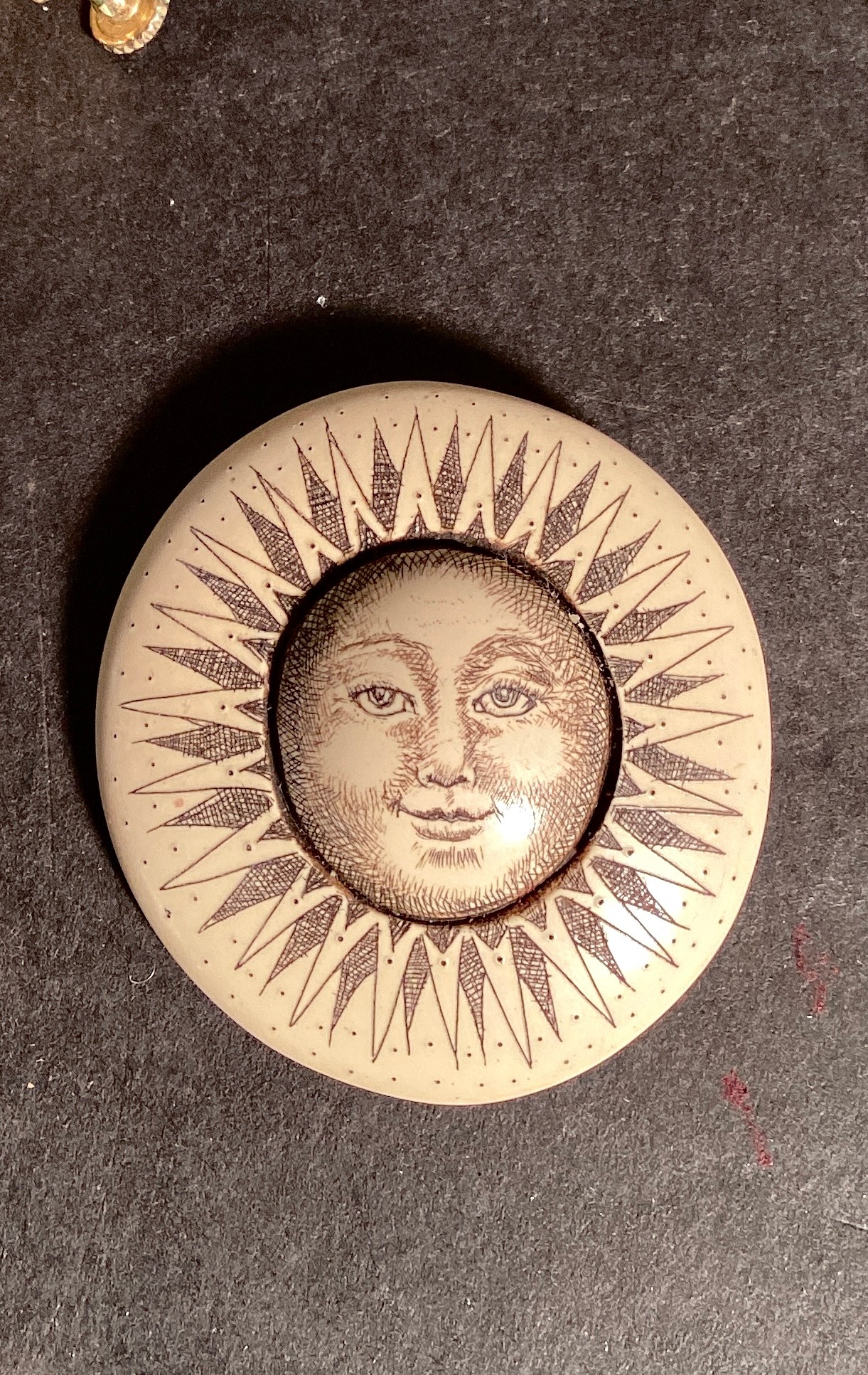 * a polymer brooch with a sunburst face. Made by Rachel Bodreau of Rhode Island.diameter is approximately 1”.