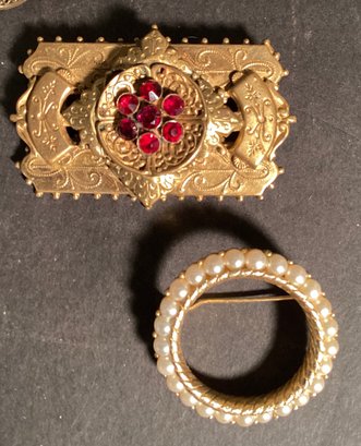 * 2 brooches that include a circular brooch with tiny faux pearls, and an ornate gold toned brooch with small red crystals.