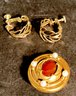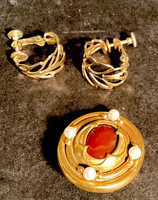 * a pair of gold toned screw back earrings and a gold toned brooch with a carnelian toned center stone. In superb condition.