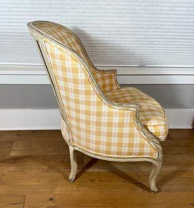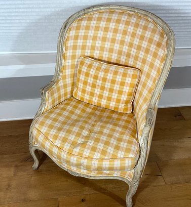 Custom made and Classic form is what you will get in this very comfortable classic French bergere arm chair. We have two that match you are bidding on one. The fabric is a lemon yellow and white check that is quilted, fabric by Lee Joffa. Both chairs are identical in every way. This chair was custom made for the present owner.cost $2800. Each