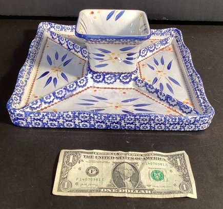 Here we have a crudite dish with four distinct areas for such treats as olives, peppers, etc. the center of this dishes a dipping dish for salsa, ranch, or other great taste treats.