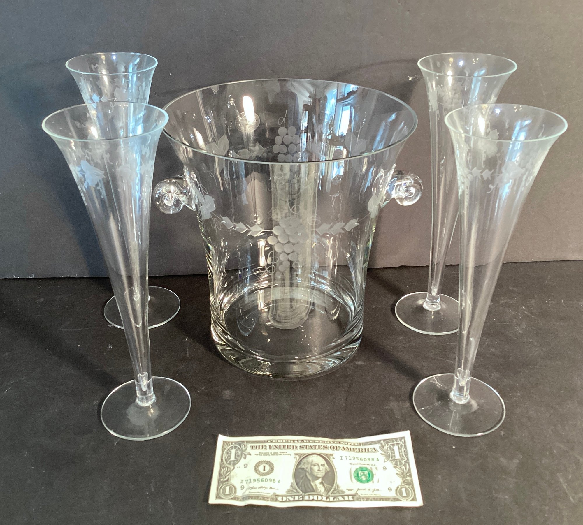 Here we have a really beautiful set of champagne flutes, and an accompanying ice bucket for your favorite bottle of champagne! They are hand blown and very elegant.