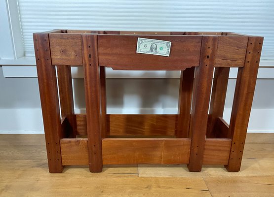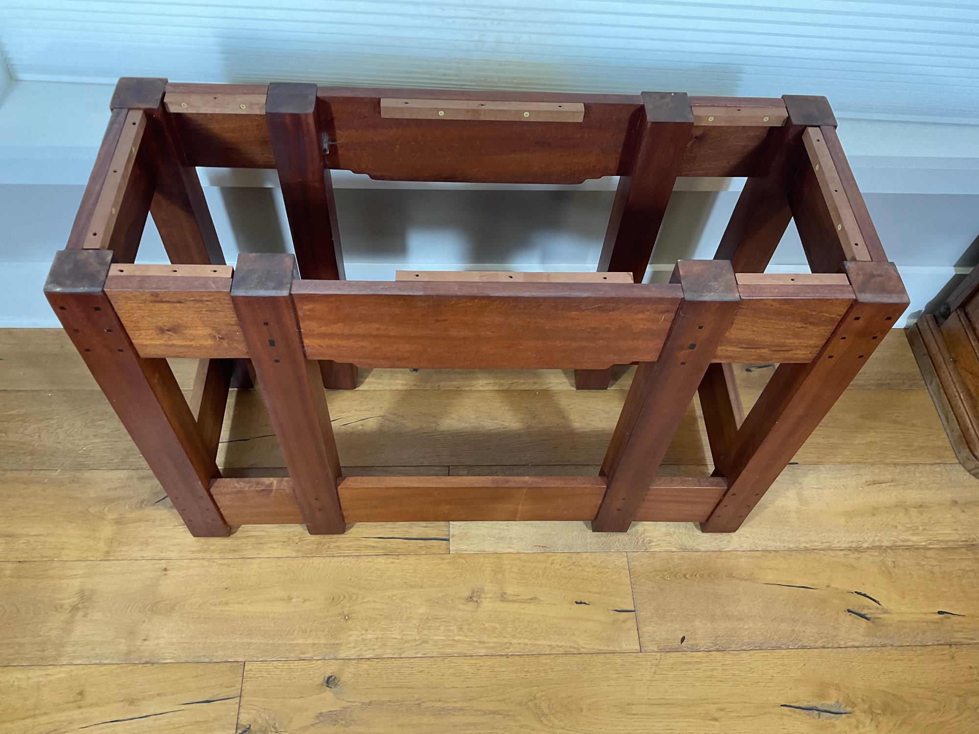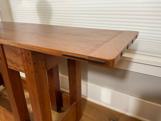 Totally handmade of teak wood. Peg through construction the top has a bread board style top and solid square legs. Ebony thru tenon pegs. Expert craftsmanship and design. Very sturdy and useful.