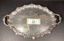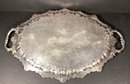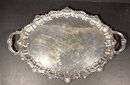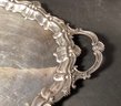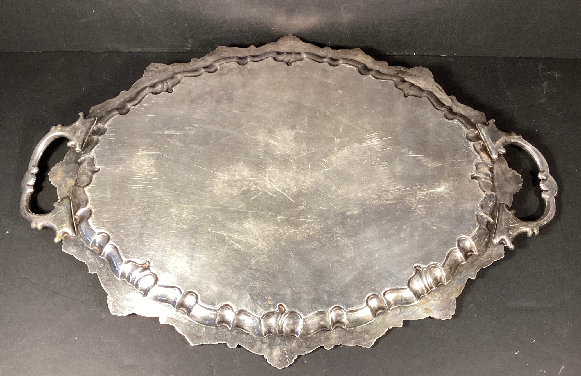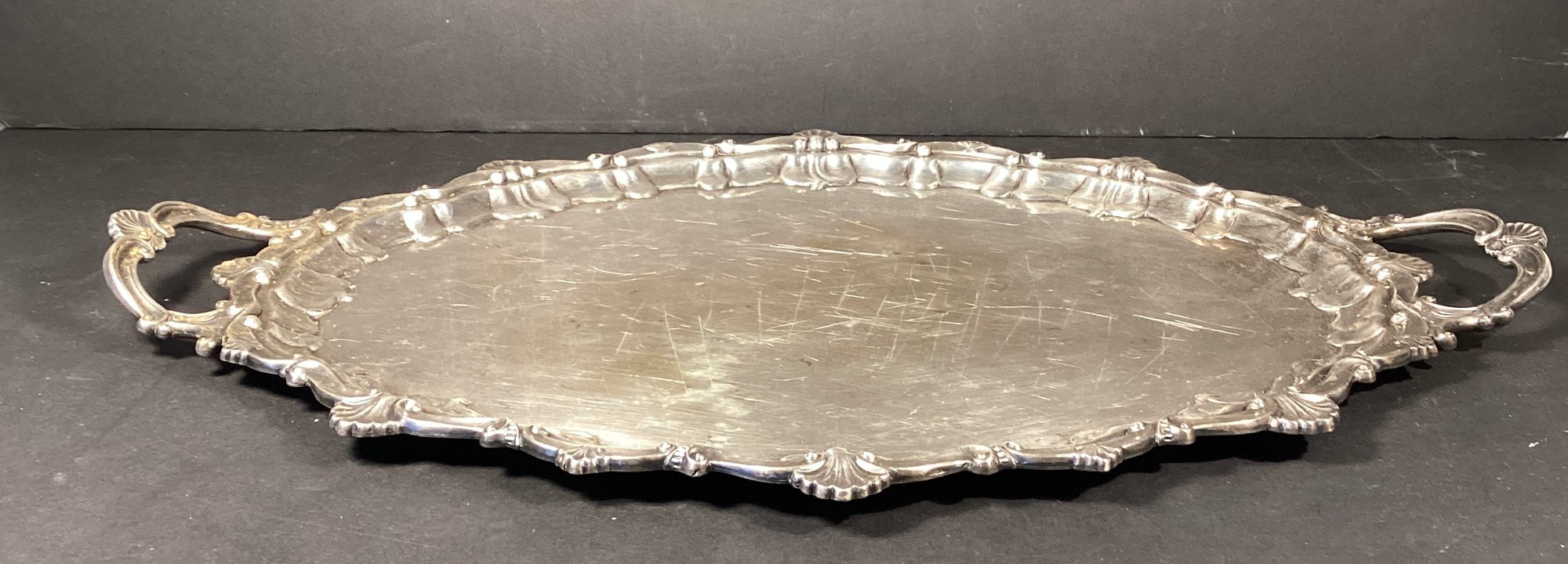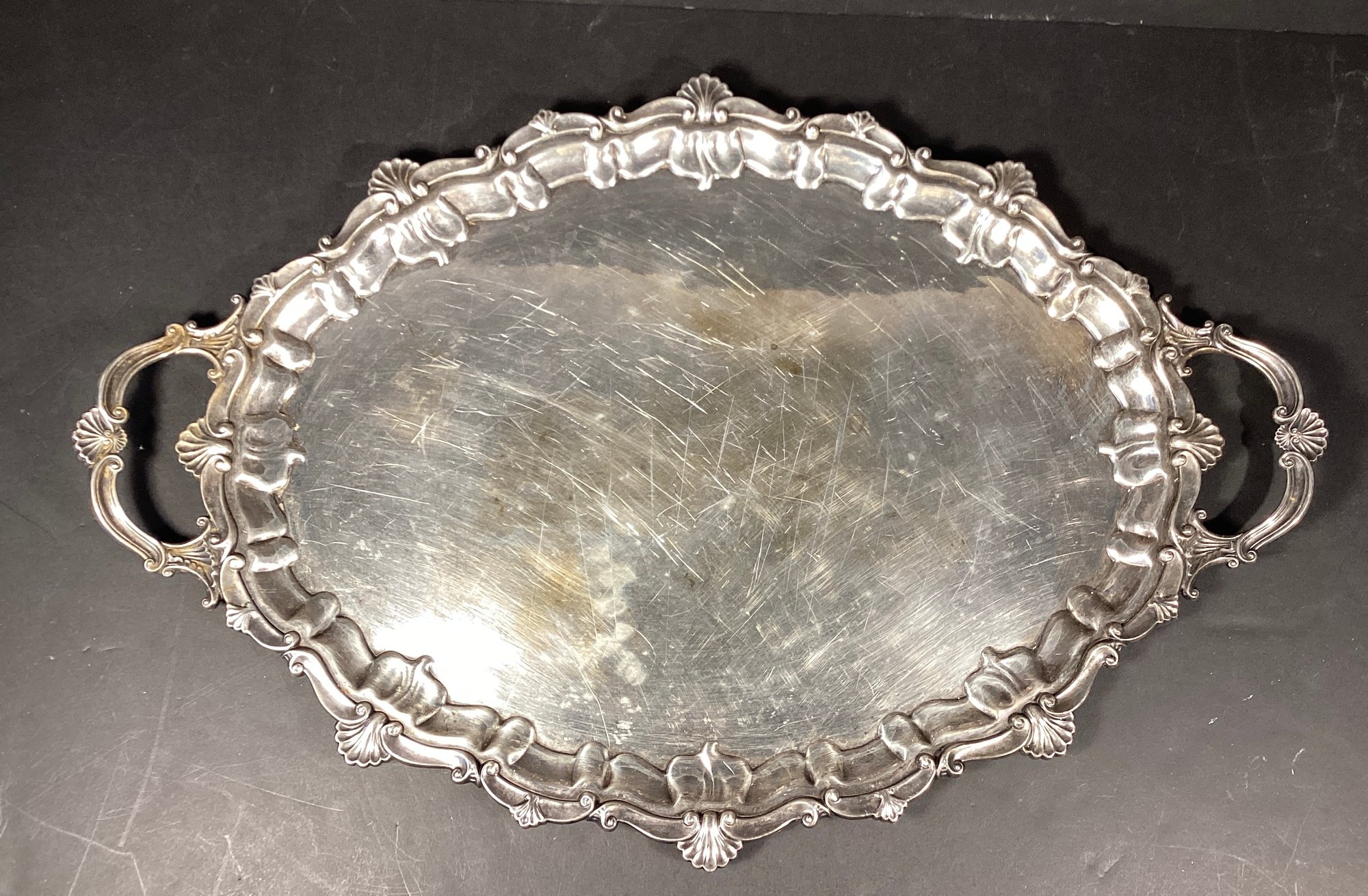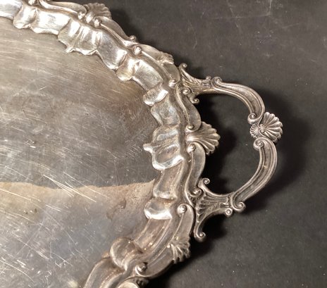 Here is very substantial serving tray for your consideration. There is a beautiful Thomas Chippendale inspired serving platter/tray, with handles. There is a repeating shell design, and has a nice patina. Note: the tray may have been used beyond serving items, as the body of the tray has multiple light cut marks as though it may have been used as a carving platter.