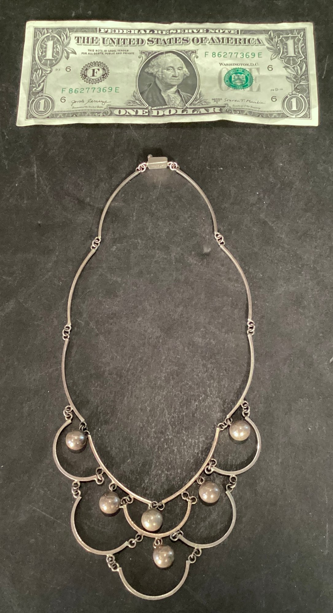 The necklace is approximately 17” and has 6 sterling silver balls attached to the necklace.
