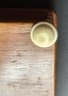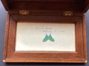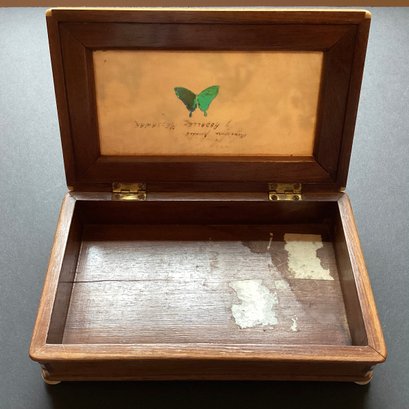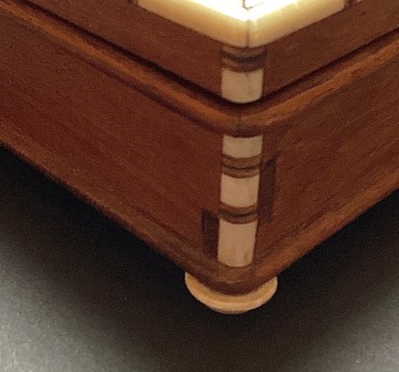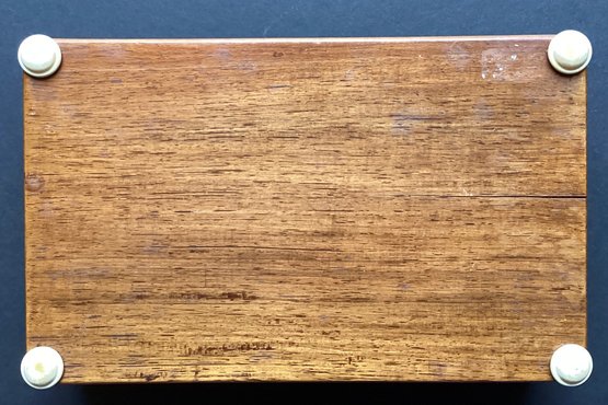 Here is a vintage wooden box with bone button feet and inlay on lid.