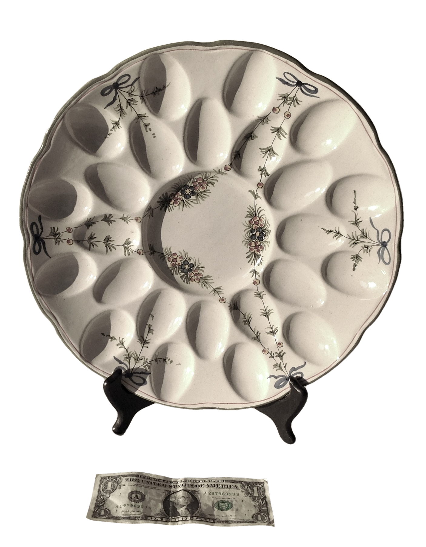 Very nice egg Platter with space for dips. Holds up to 24 eggs. Hand painted with hand painted blue bows and flowers. Signed on bottom ITALY