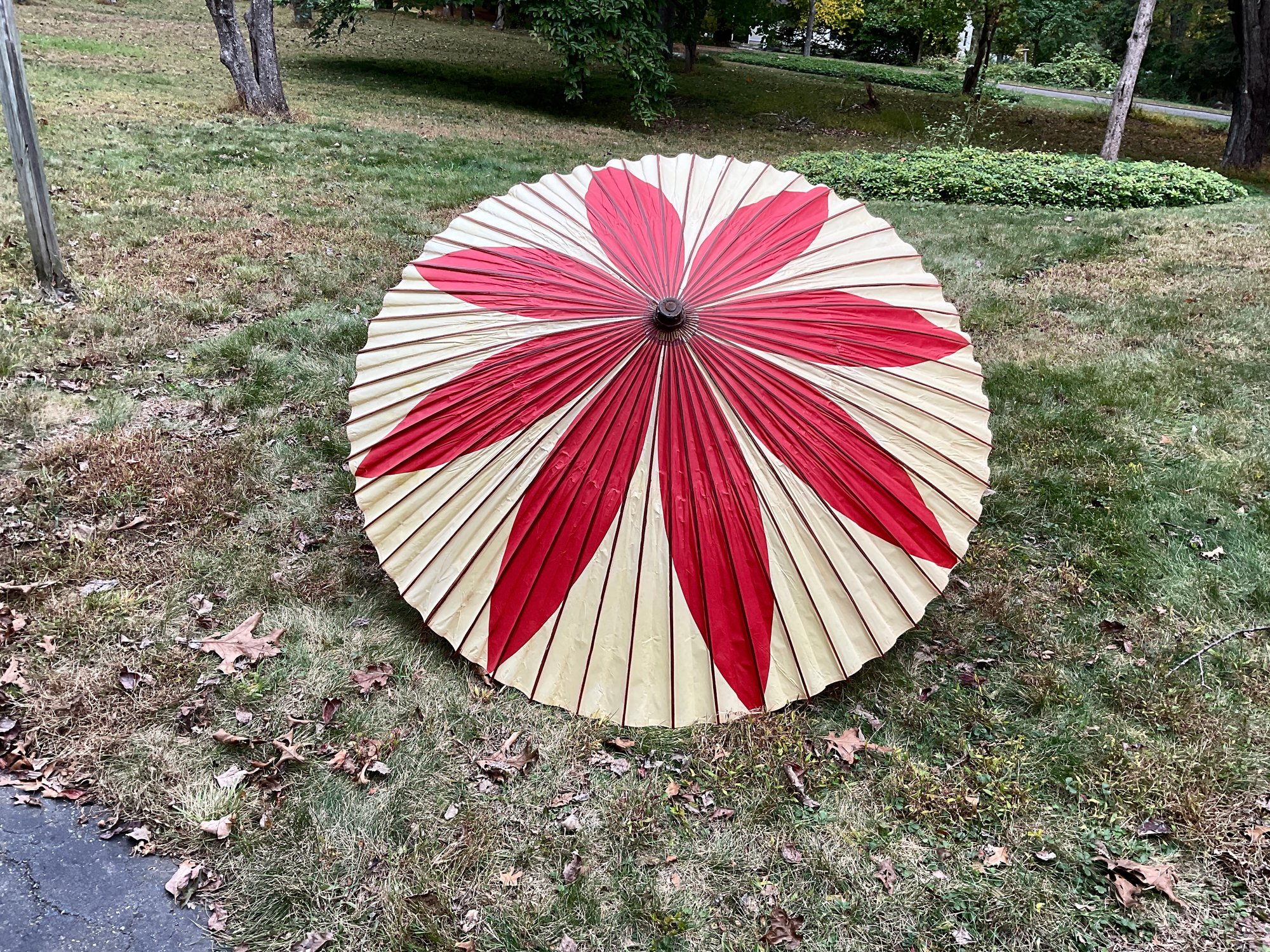 This is a very decorative handmade Japanese umbrella probably from the 1950s. It is marked Japan and opened up is 5 feet in diameter. There’s no issues with this umbrella decorative.
