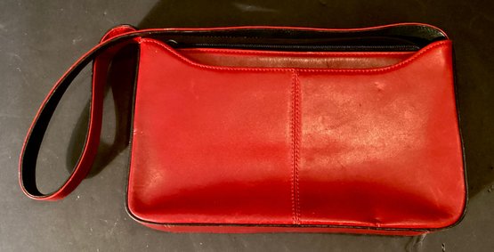 Here we have a great red leather Kenneth Cole small bag. It’s large enough for iPhone, credentials, make up mirror, etc., is a beautiful shade smooth red leather with a black material interior. The Kenneth Cole name is imprinted in the front of the bag and the bag itself has a center zipper lining And an additional inner zipper liner for coins, handkerchiefs, etc.