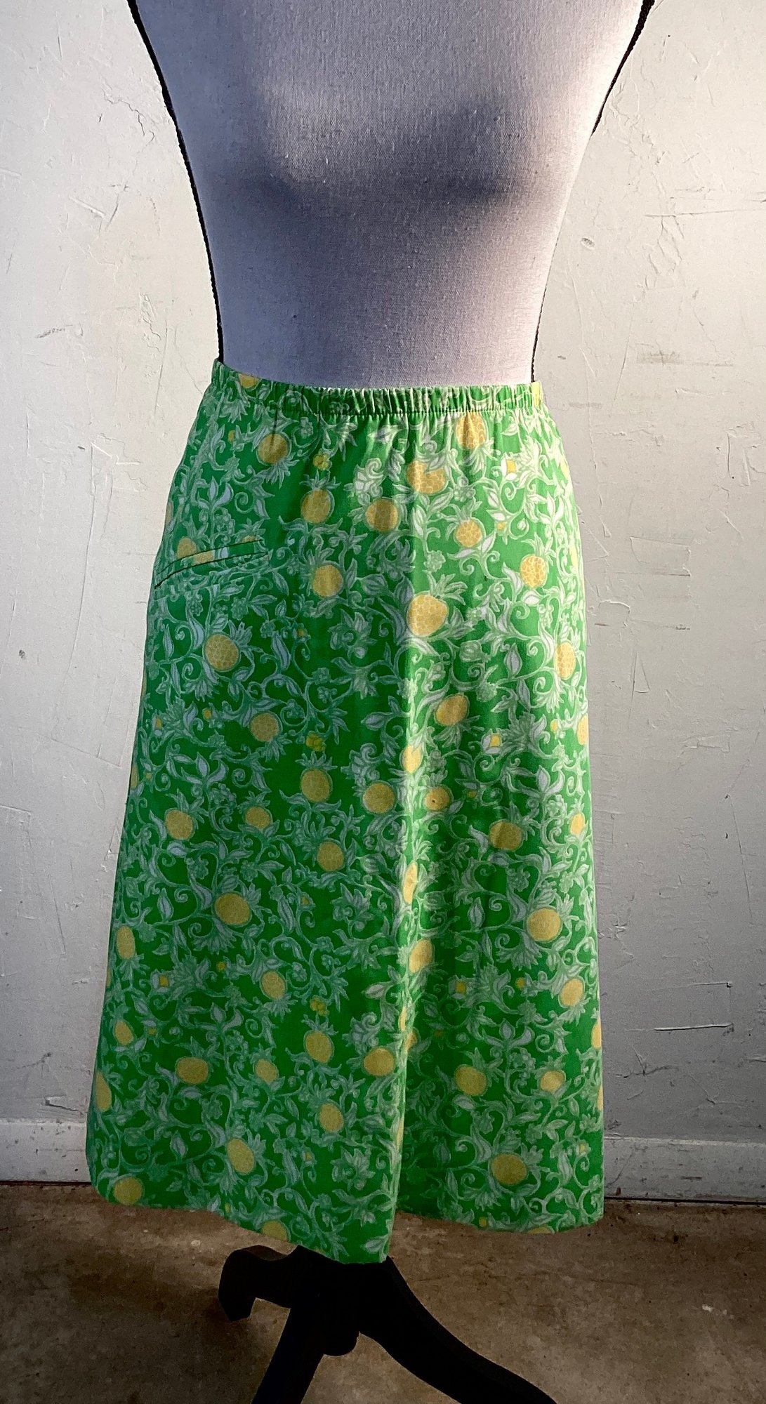 This has a bright green background with yellow pineapples that have been designed in a swirling pattern.