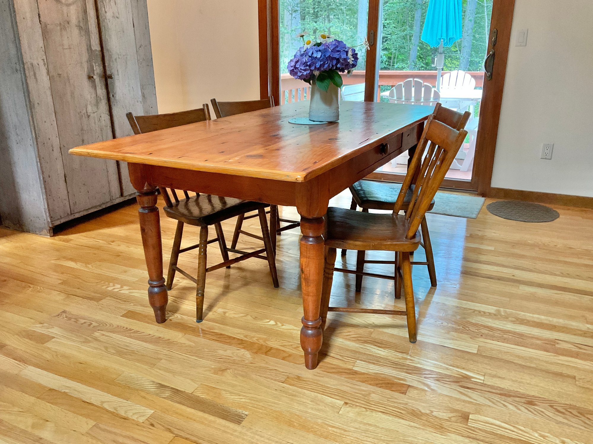 This farm table is 30 as it gets made of pine and maple with breadboard ends and drawer. Purchased approximately 30 years ago and a local antique store. I believe this might be made by Albert Dew formally of Guilford.