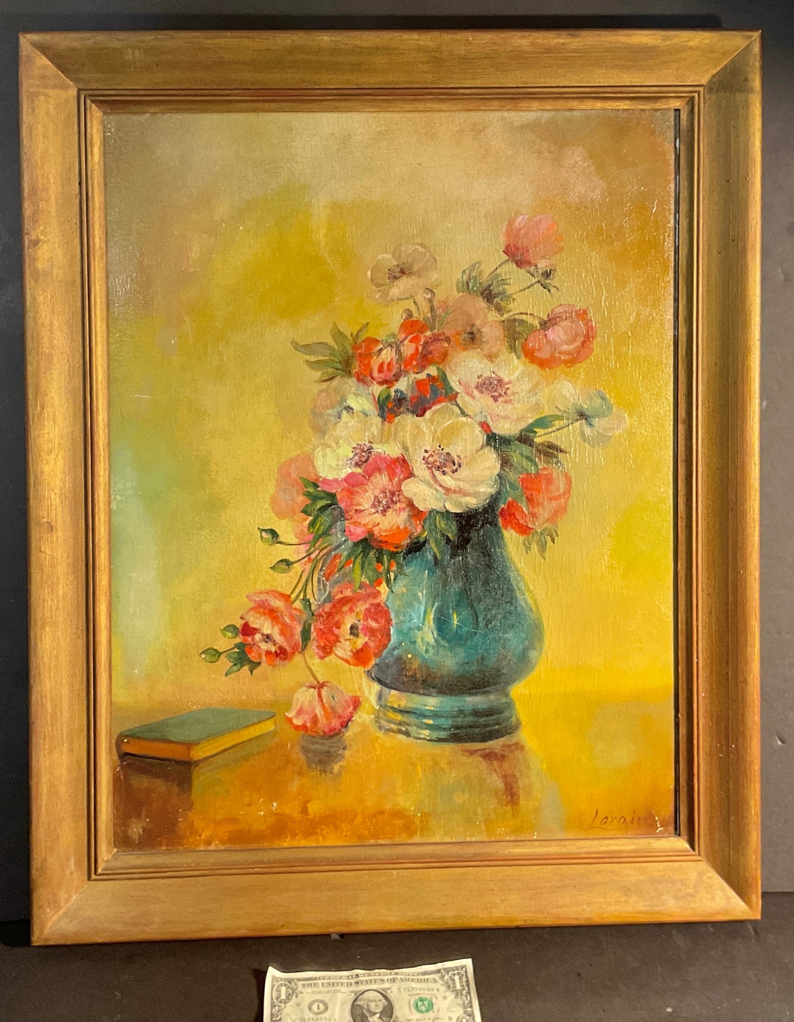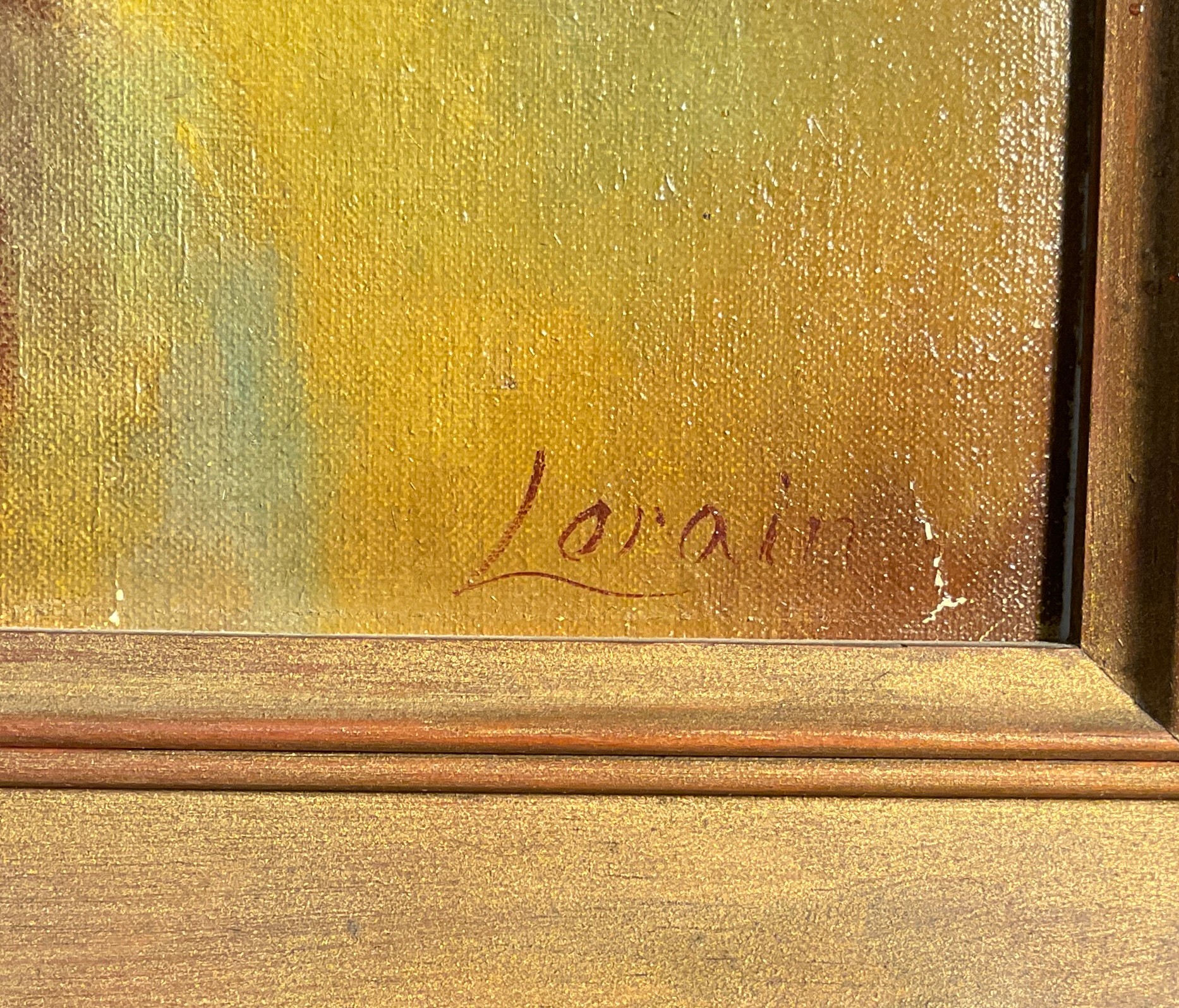 It is signed in the lower right hand corner LORAIN. It is framed and an appropriate gold frame and is in good condition but could use a cleaning.
