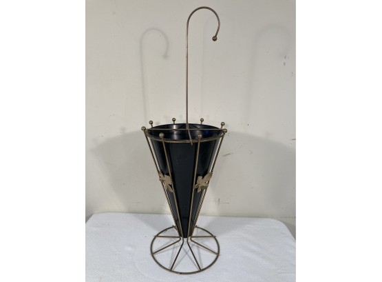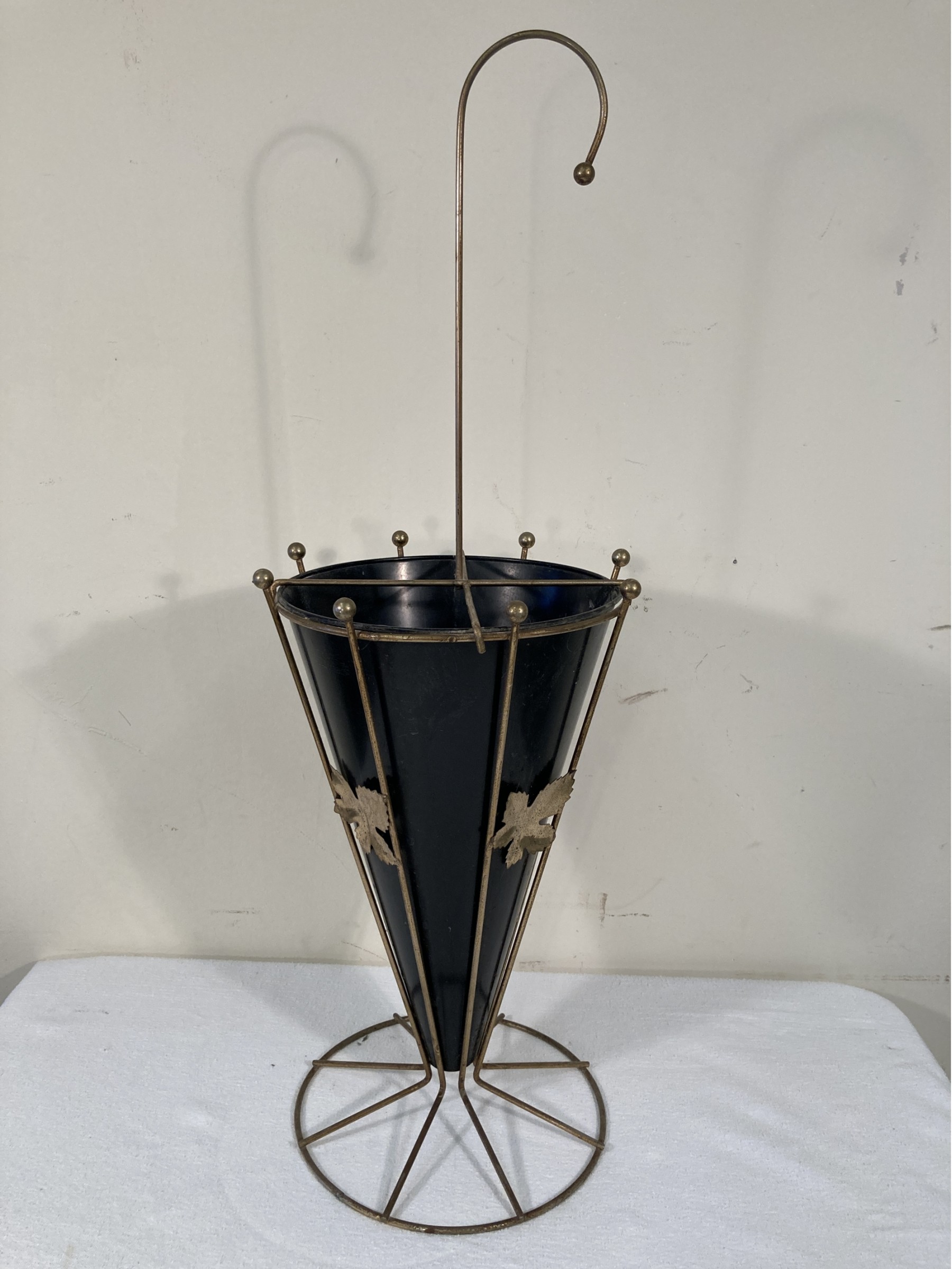 Selling a vintage metal umbrella stand with brass toned frame and black metal center.