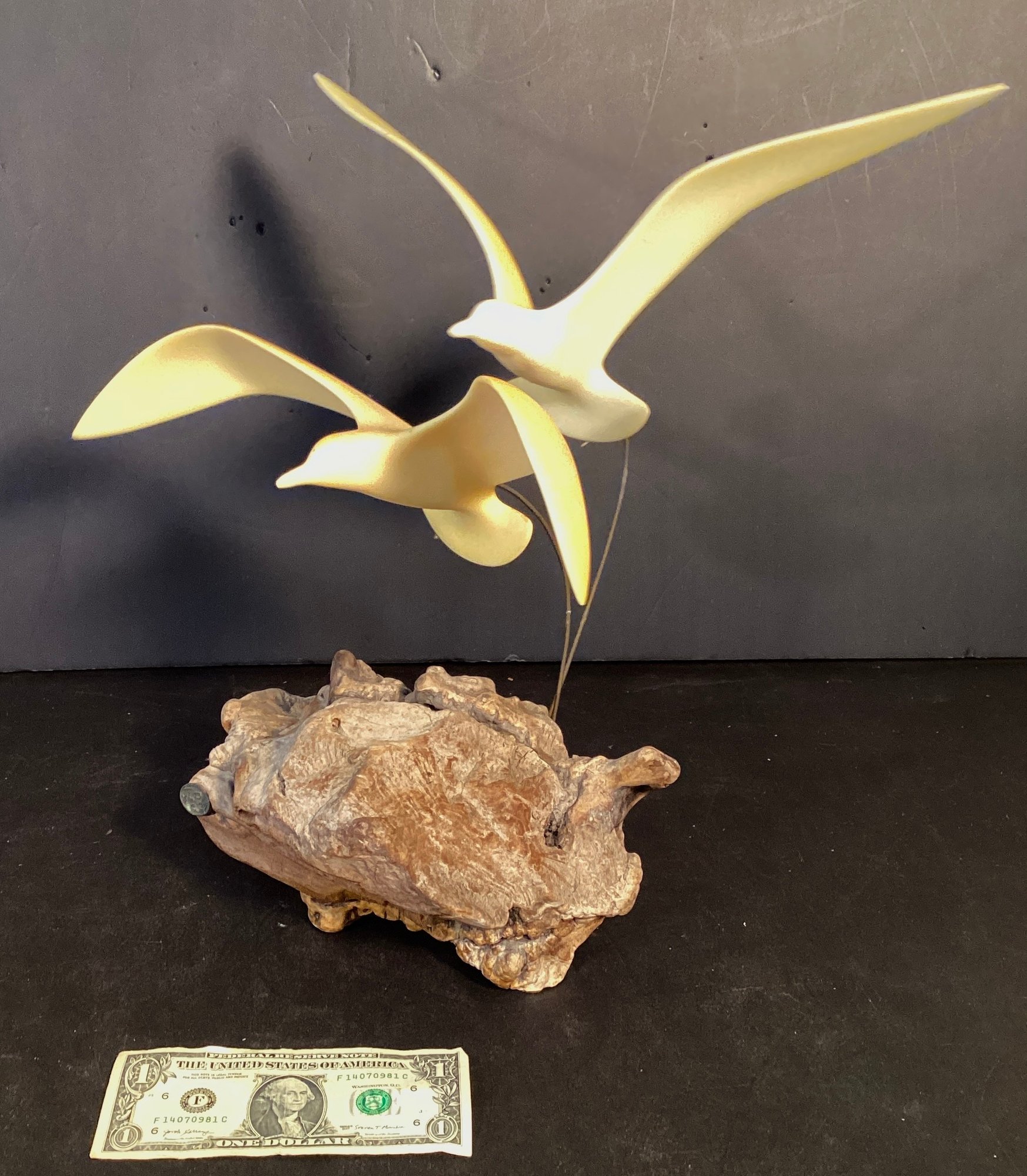 * this sculpture consists of two cream toned resin seagulls mounted on thin metal rods that flex attached to a burl wood base.