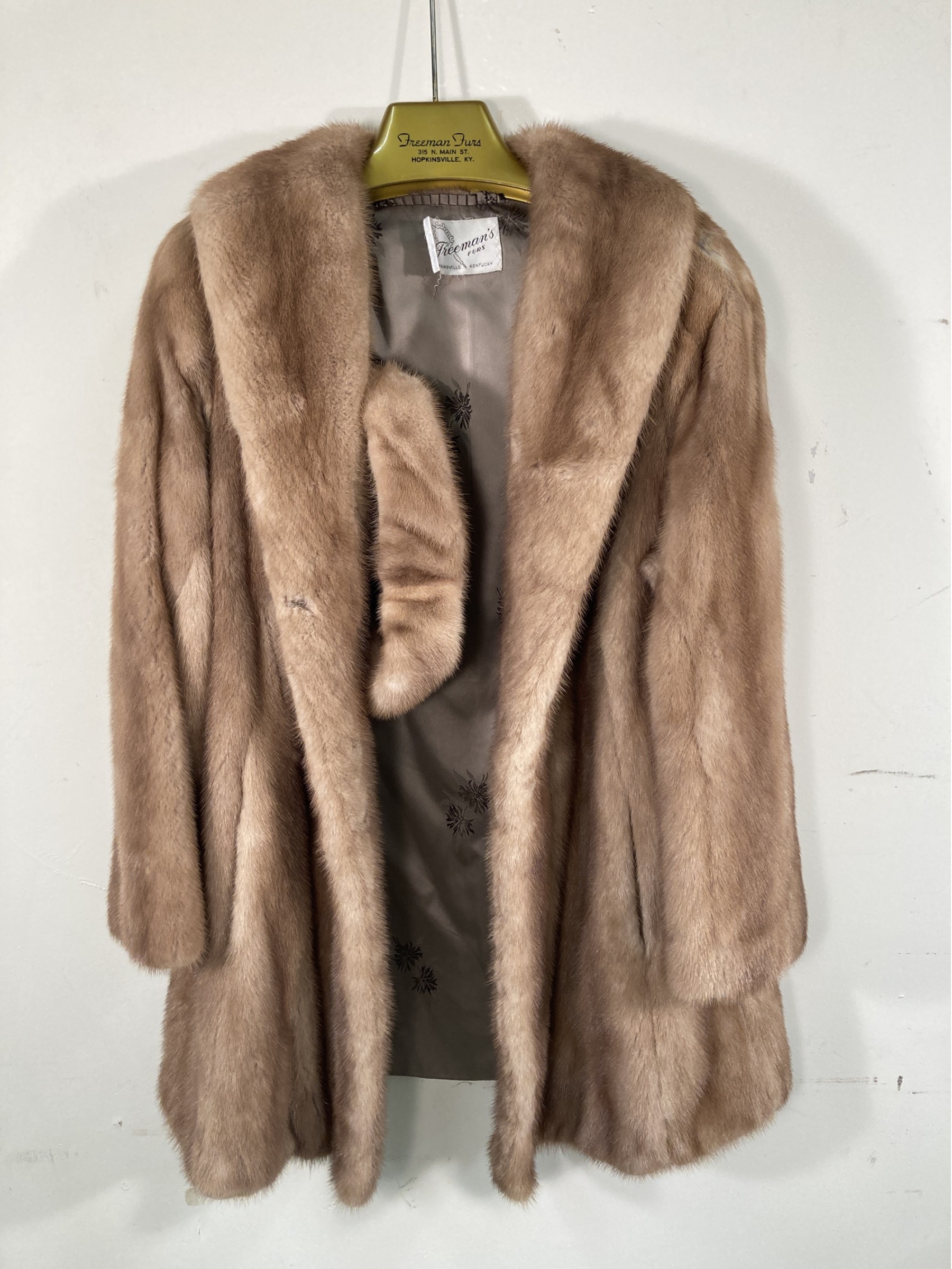 Selling a very clean and well taken care of natural mink coat with matching hat, made by Freeman’s Furs of Hopkinsville, Kentucky. The coat is monogrammed inside has two outside pockets and one inside pocket.