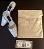 * The shoe bag is designed of a pale, mint green brocade with a gold star designed button. This is the perfect pouch to hold these fabulous shoes.