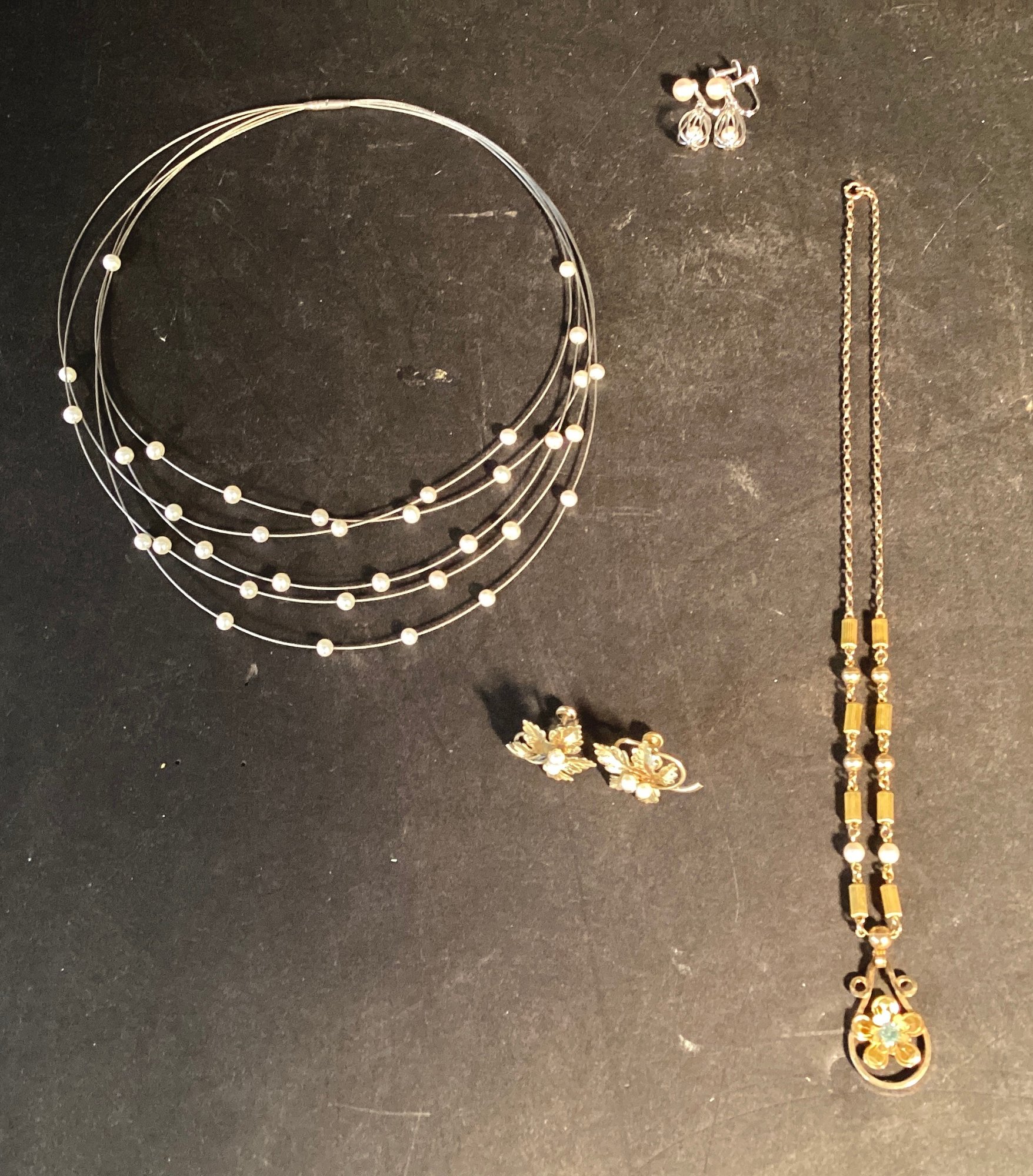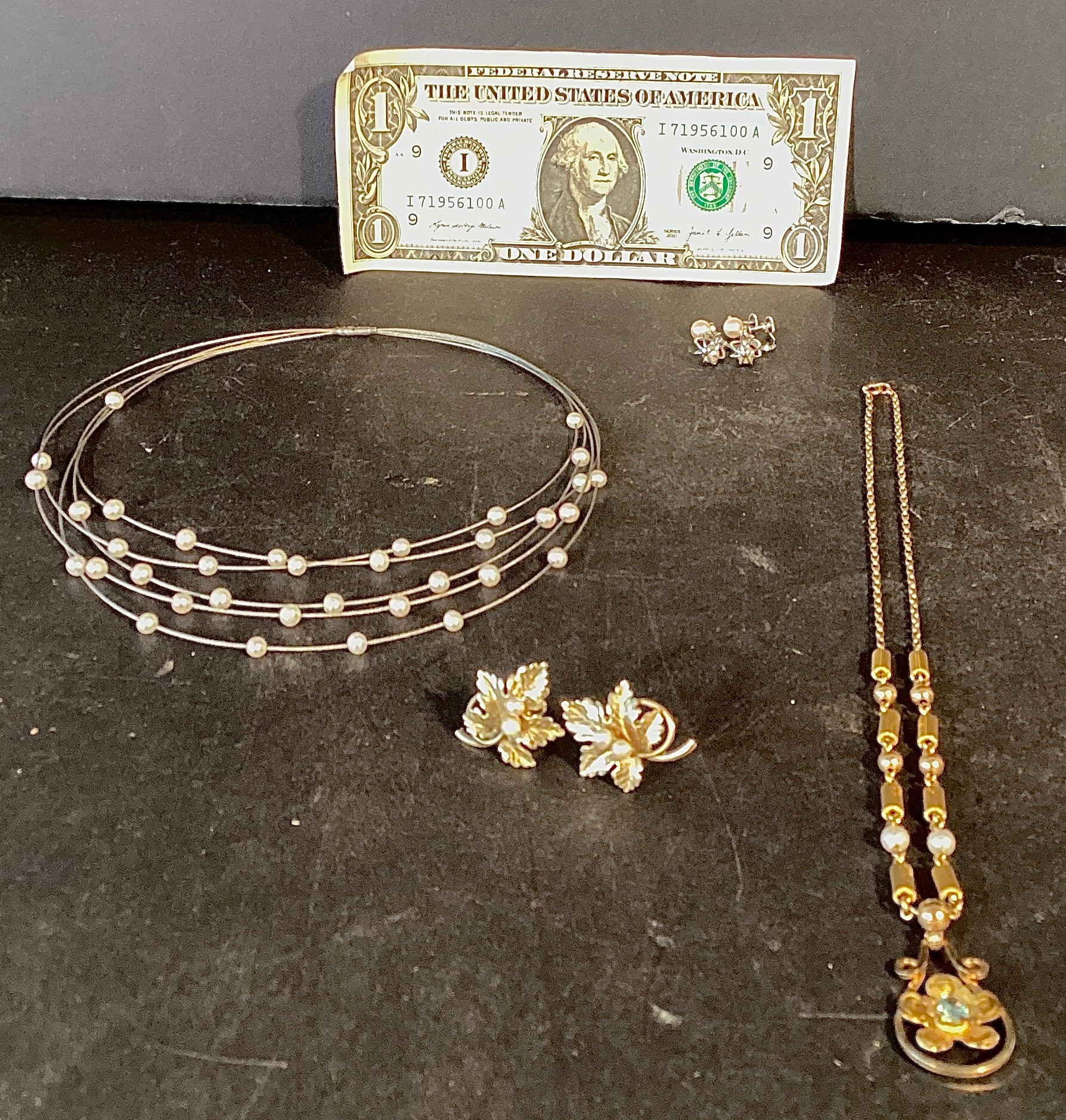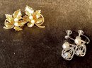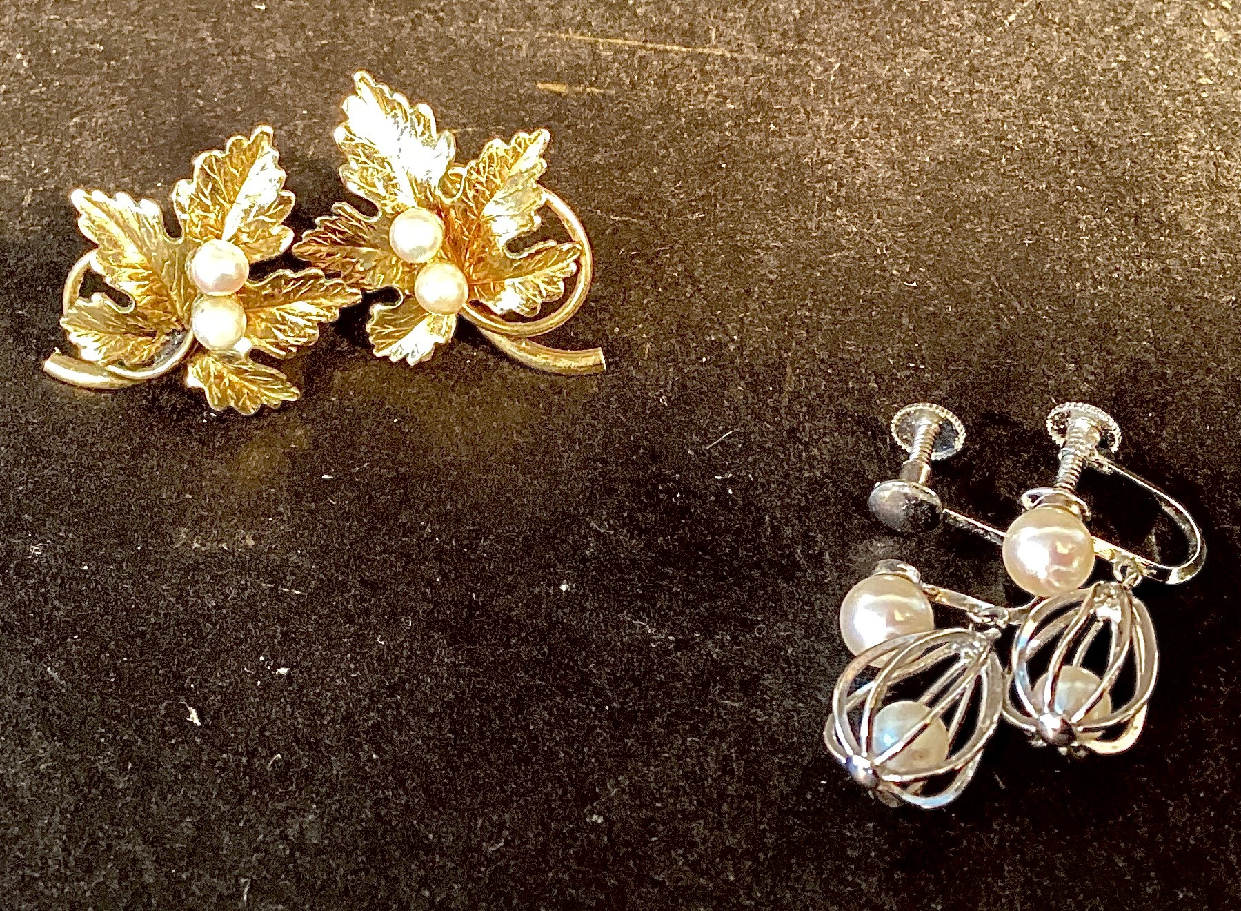 * 2 pair of screw-back earrings. One pair has a pearl in basket design in silvered metal, and the other pair have a leaf design with pearls. Gold filled.