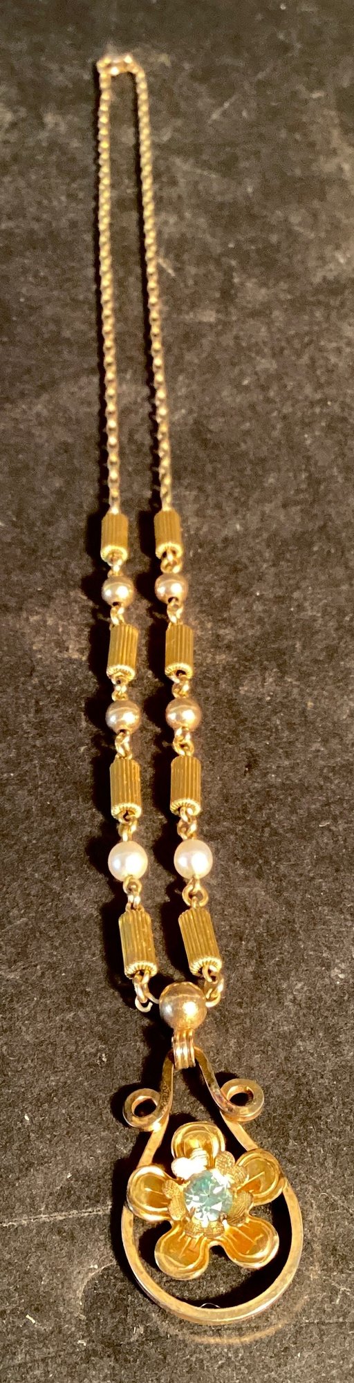 * an antique gold toned necklace withfaux pearls, gold toned chain,and a gold filled pendant with a faux aqua,Arnie fro. The L.S. Company, likely from the 1930’s era.