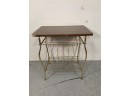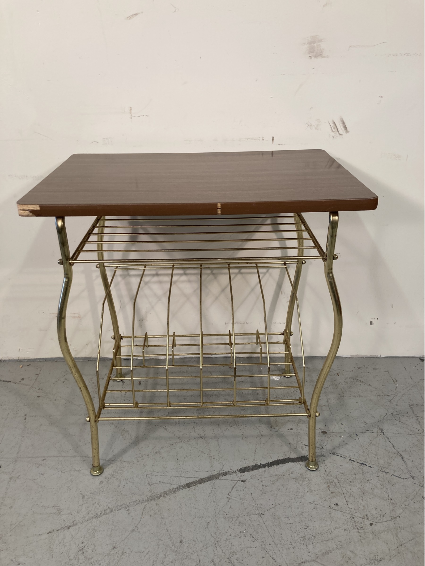 Selling a vintage record stand made with brass and has a laminated top. Useful storage for records below.