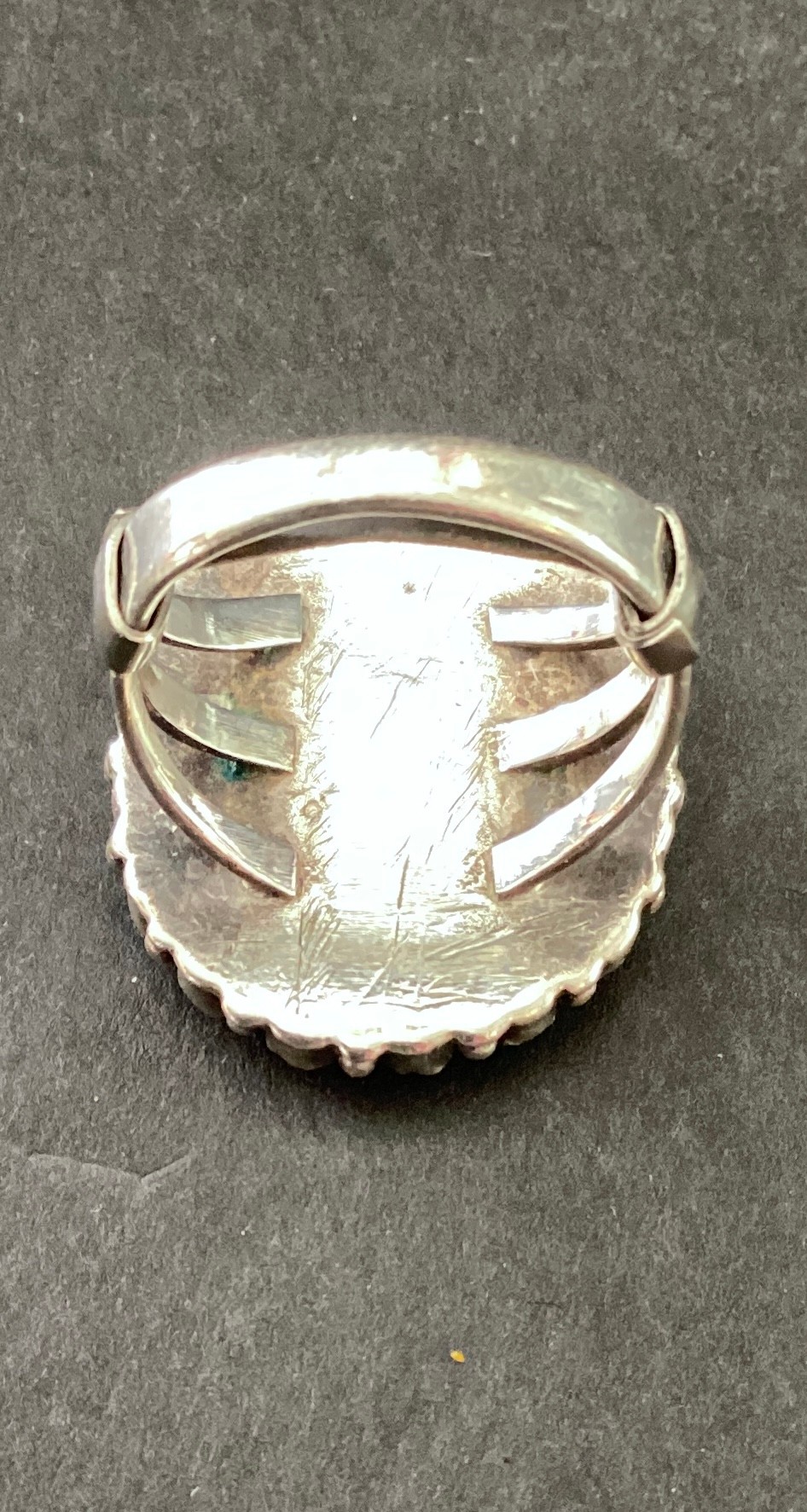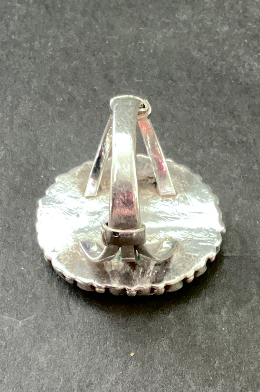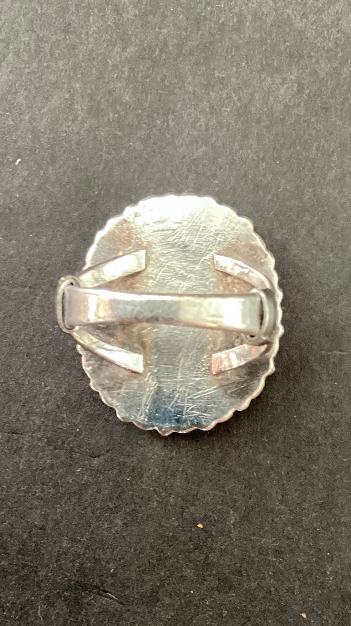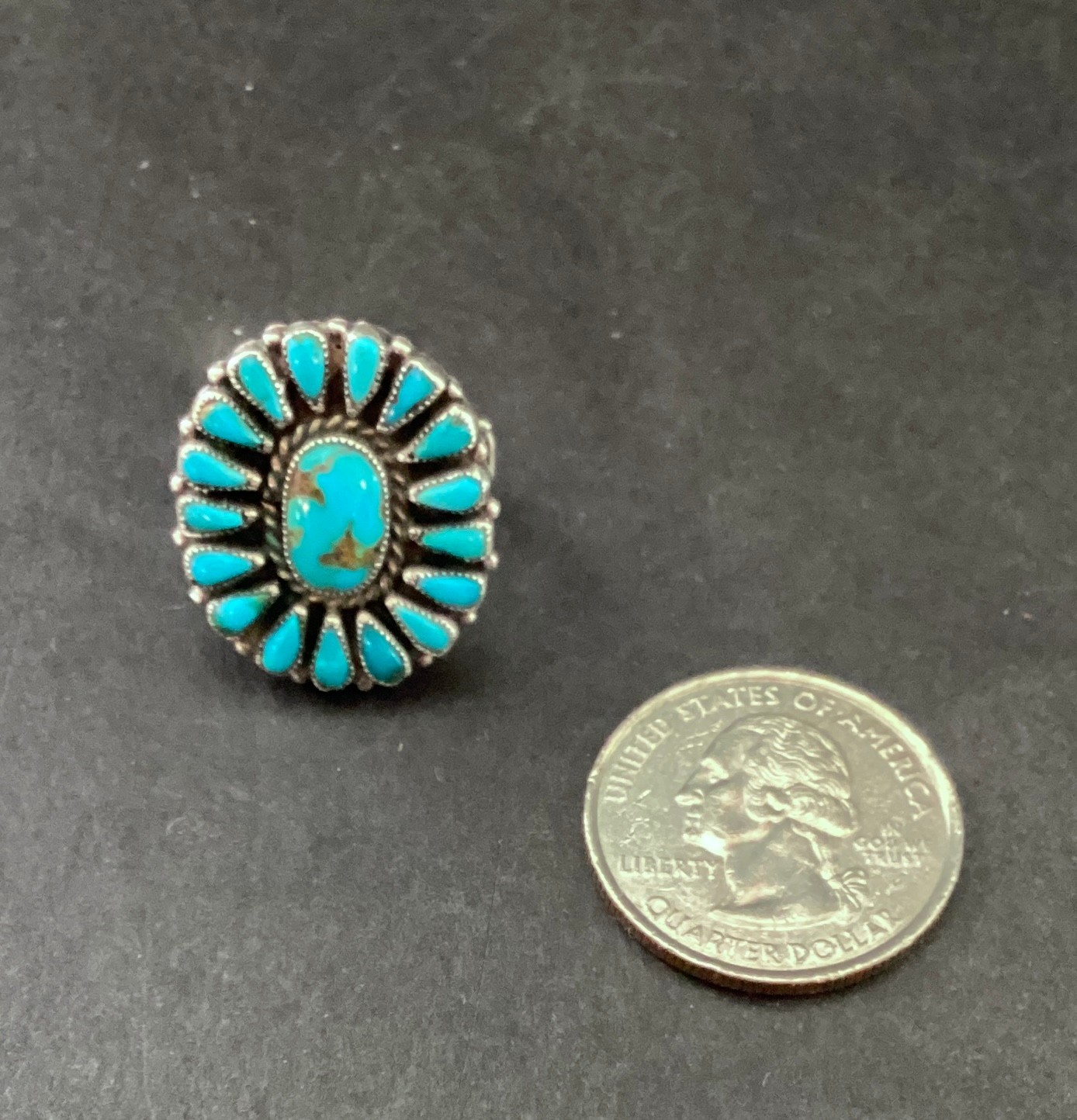 17 small teardrop turquoise stones surrounding a a small oval center turquoise cabochon.