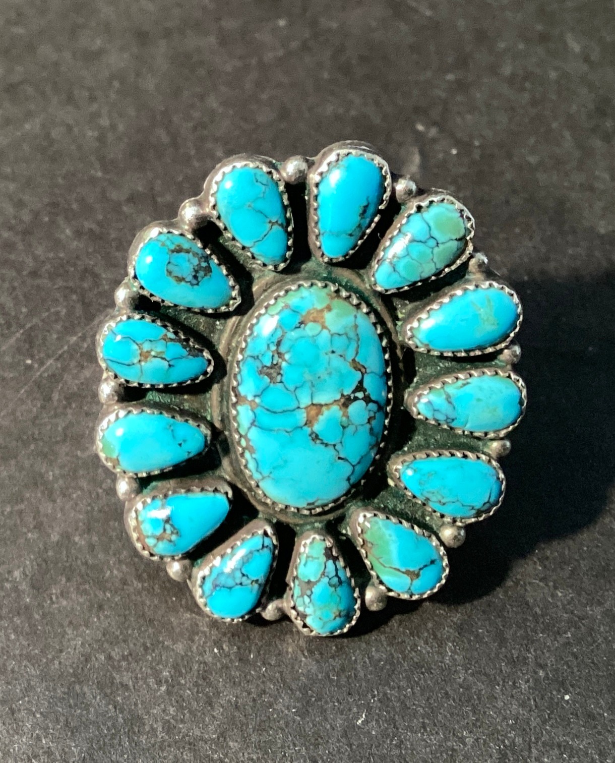 * 13 teardrop shaped stones surround an oval center stone.