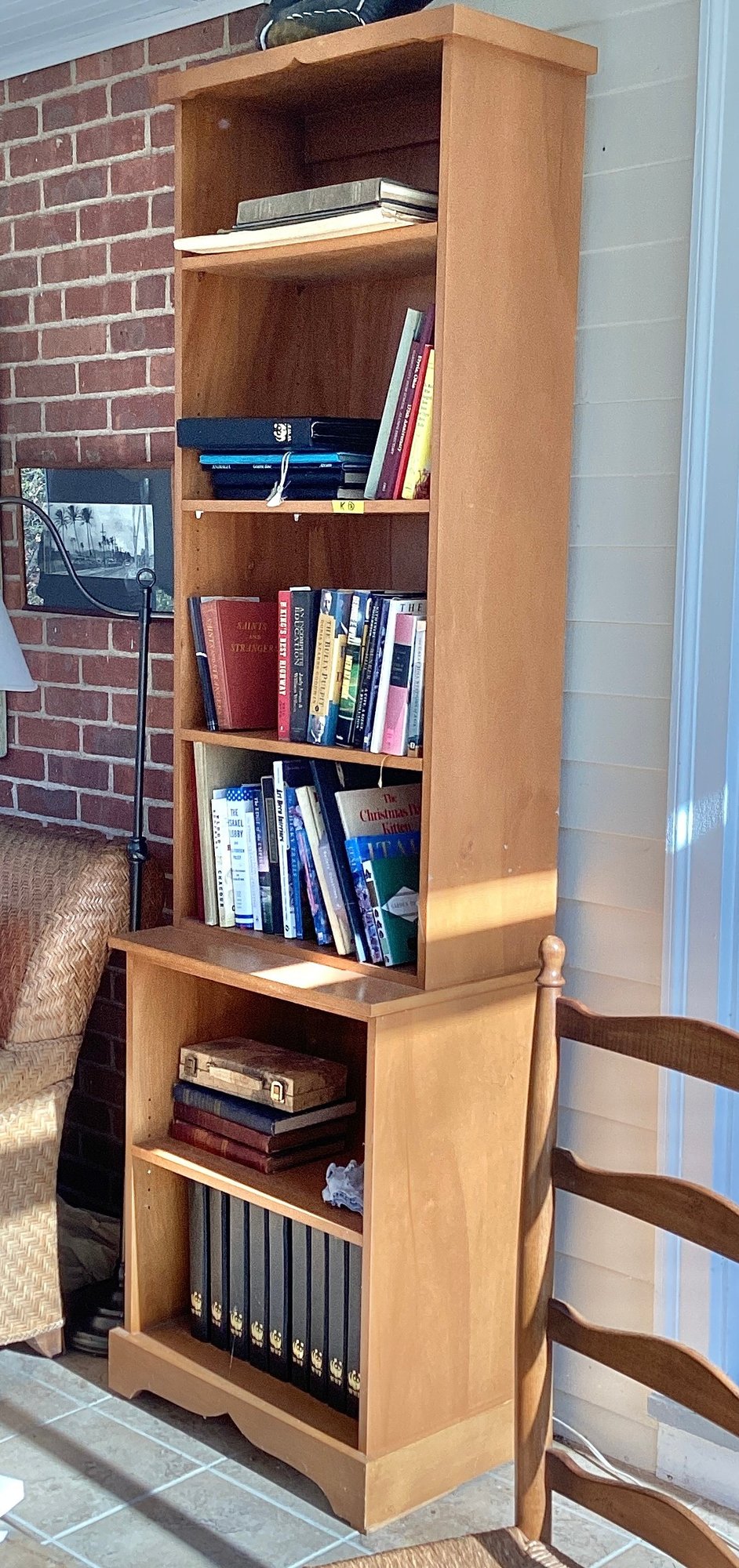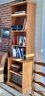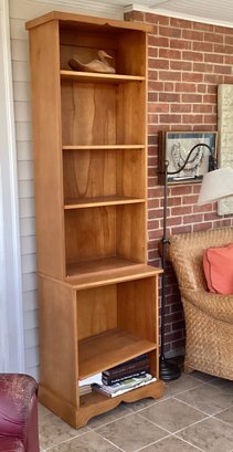 Here we have a nice proportion narrow bookcase with adjustable shelves. The bookcase is made out of solid wood and is one piece. Clean and ready to use.