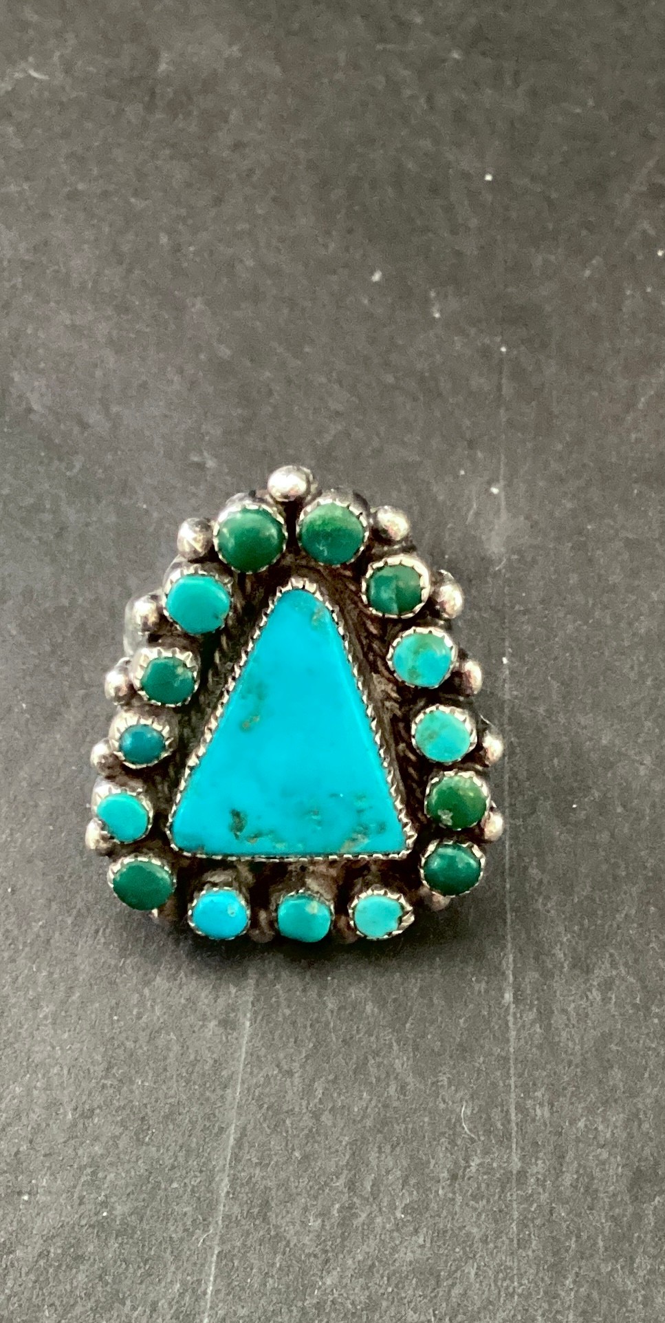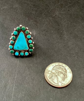 Here is a vintage southwestern ring with 15 small round turquoise stones surrounding a triangular turquoise center stone.