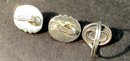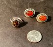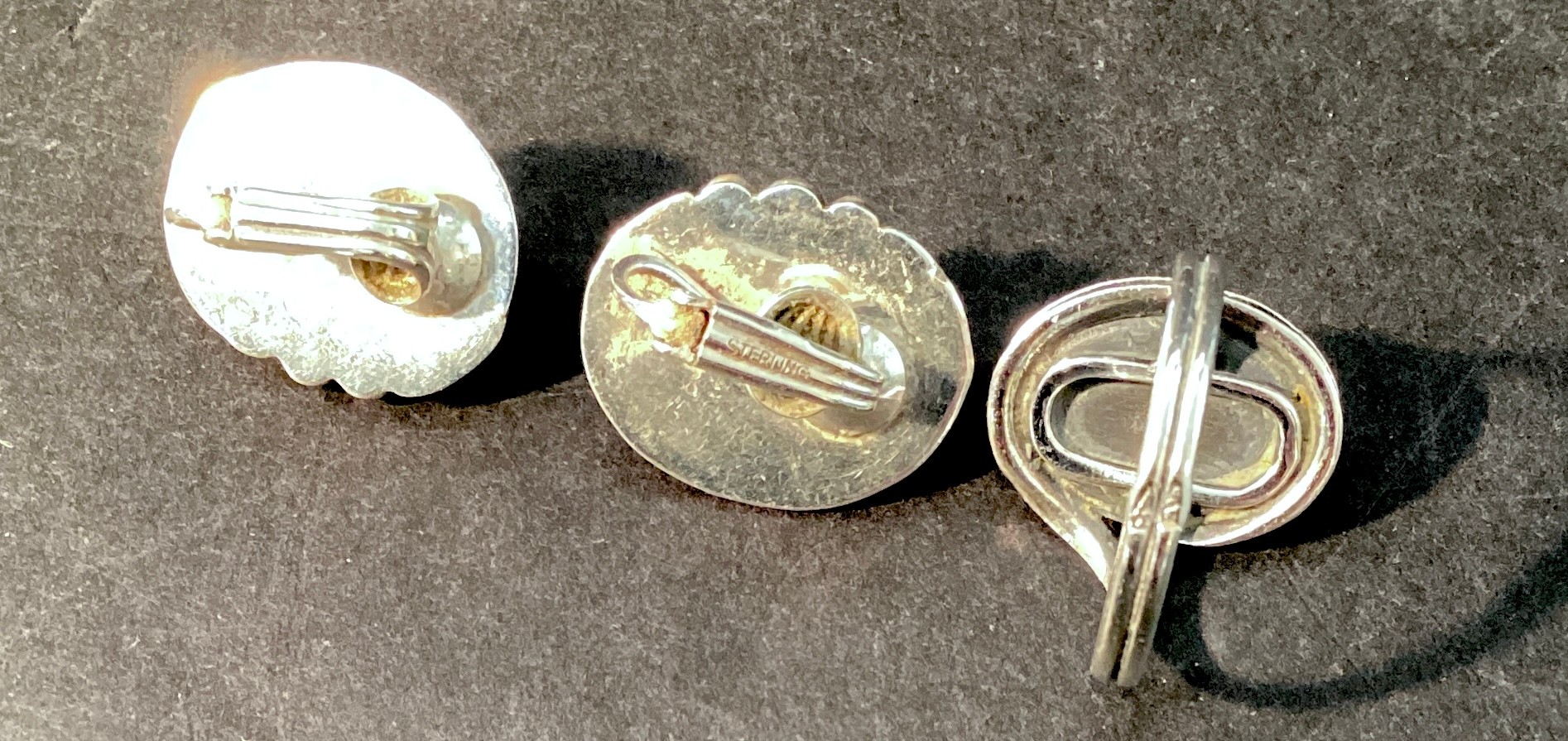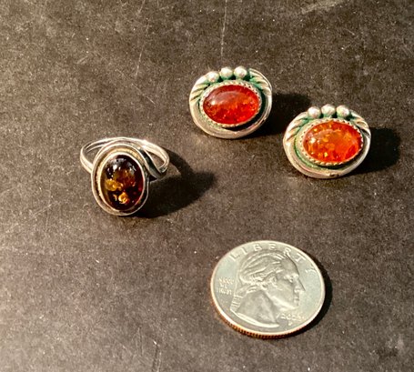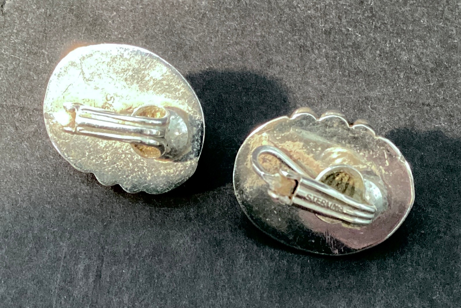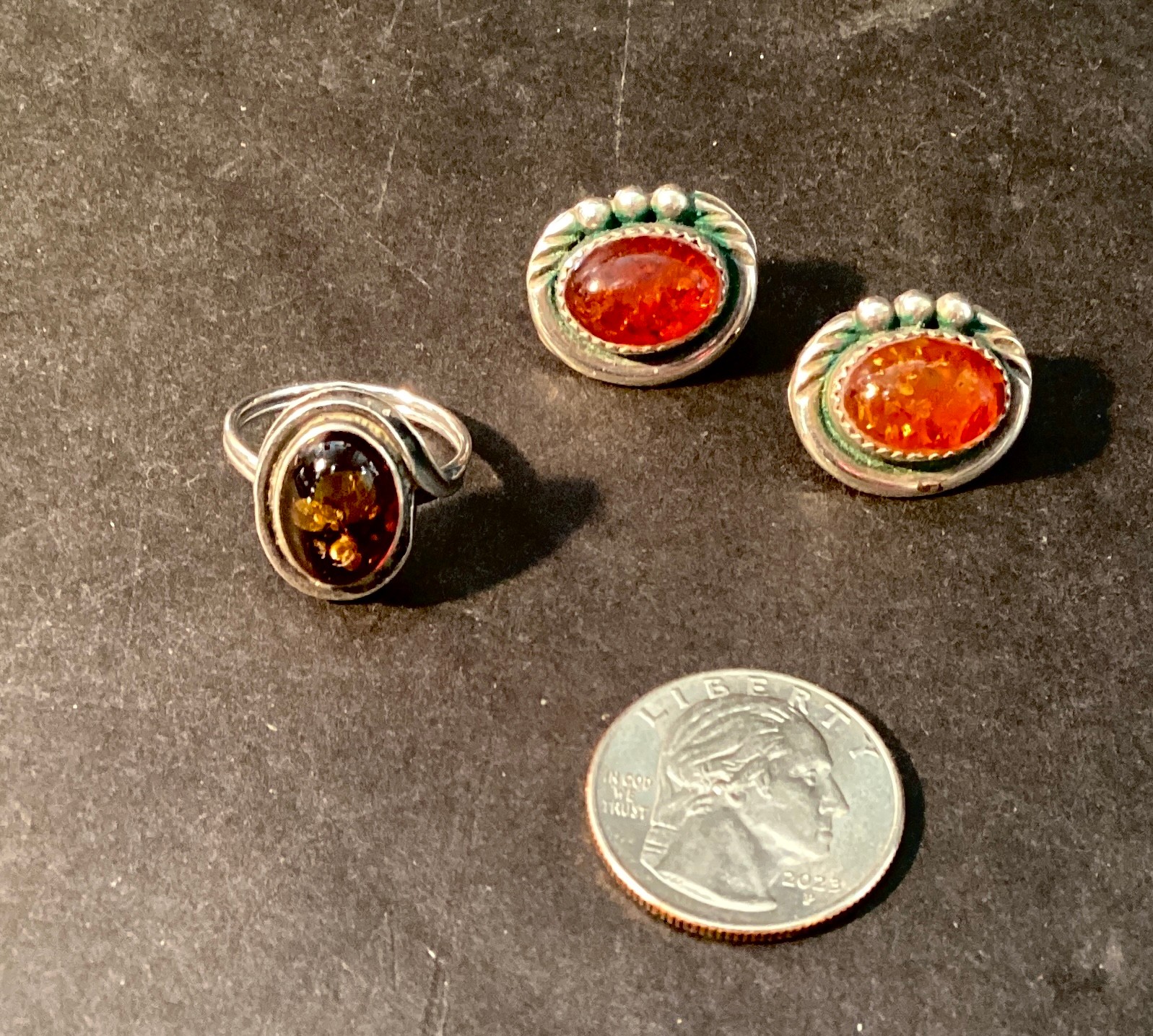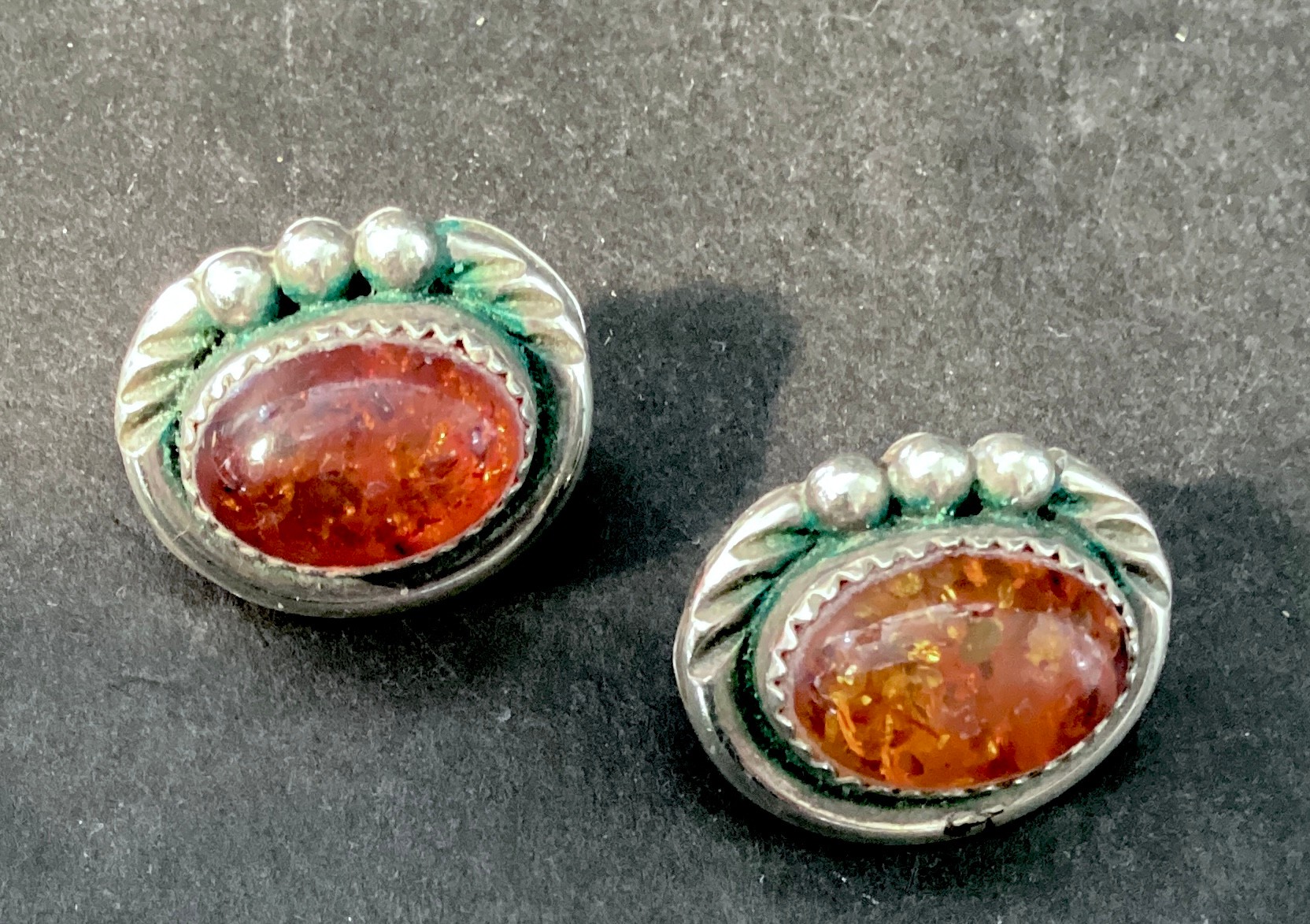 * sterling clip earrings with amber cabochons and silver accents on face. Sterling imprint on back of earrings .75” in diameter.