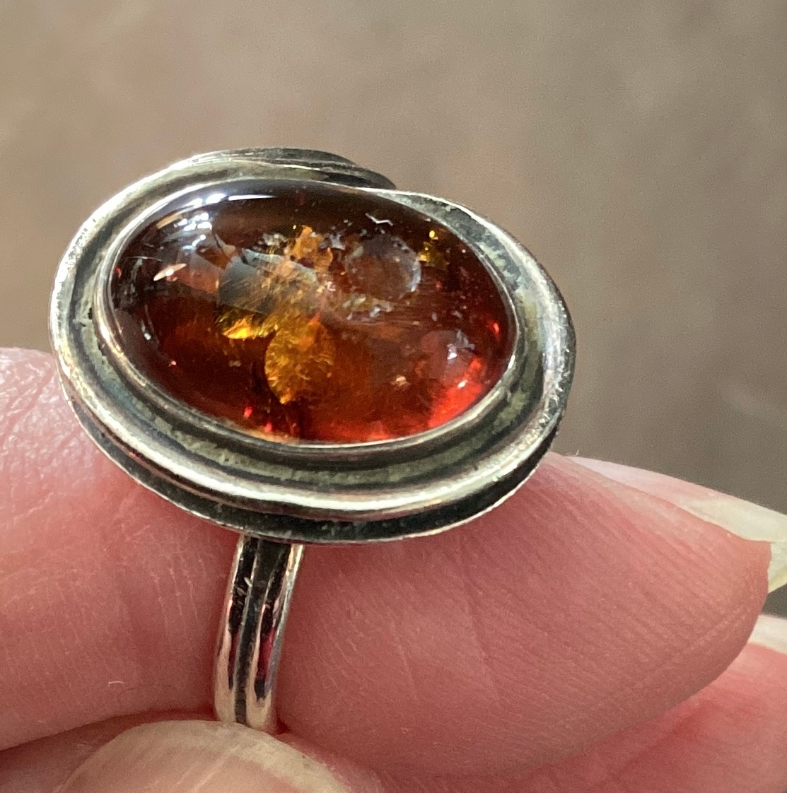* sterling and amber ring in size 7. Slim band. Has a slight indentation on face of cabochon. Tests as sterling.