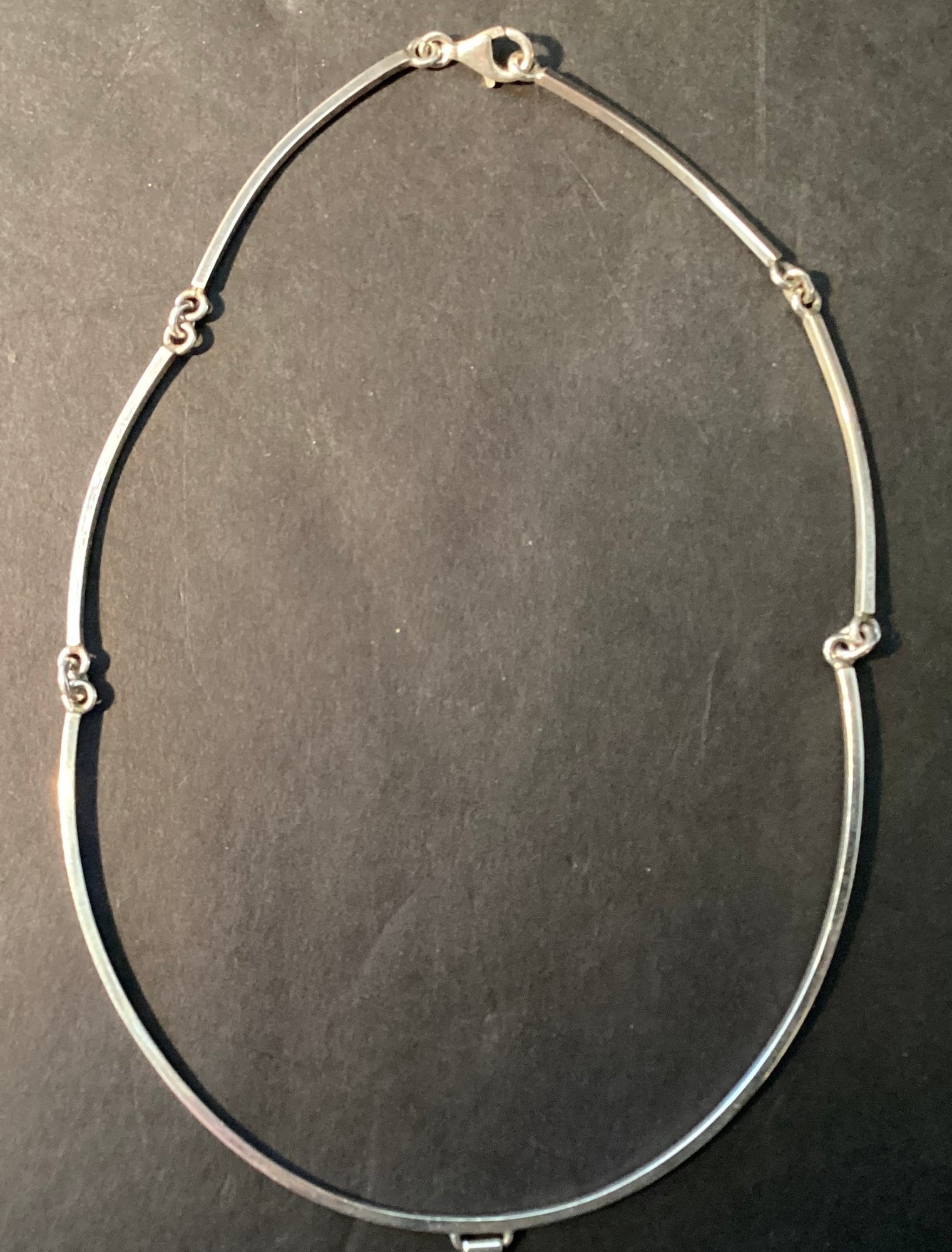* 3” pendant. Sterling mark on one of the slim curved bars of the necklace.