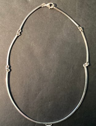 A flexible sterling necklace that has slim curved silver bars connected to form a 16” necklace.