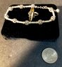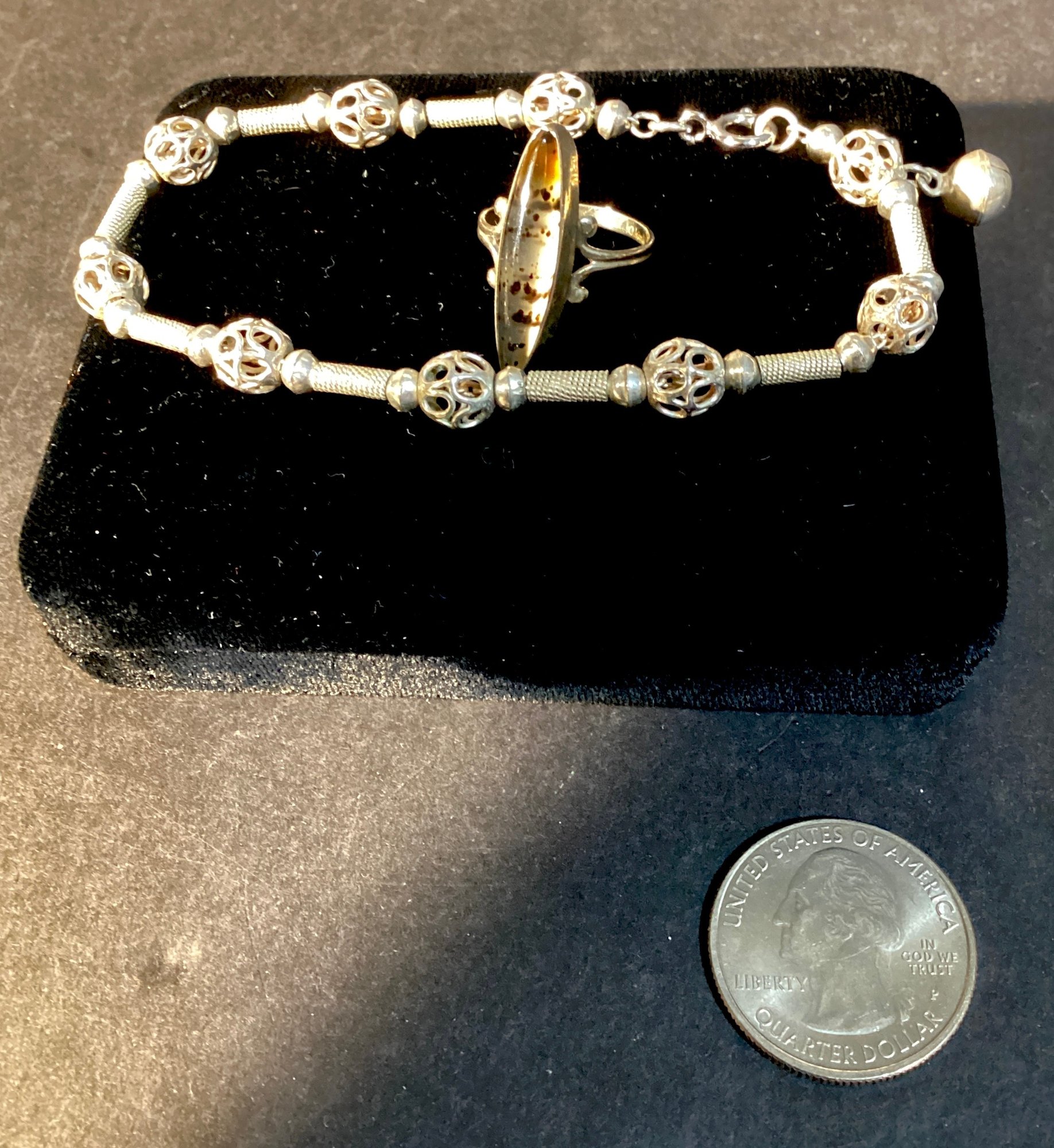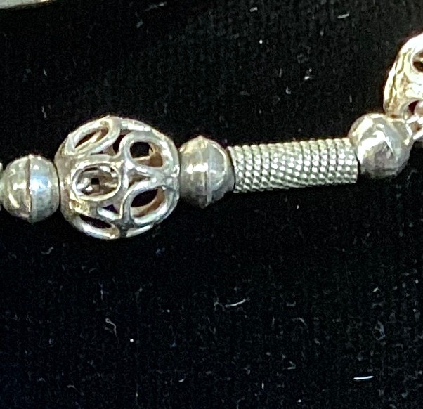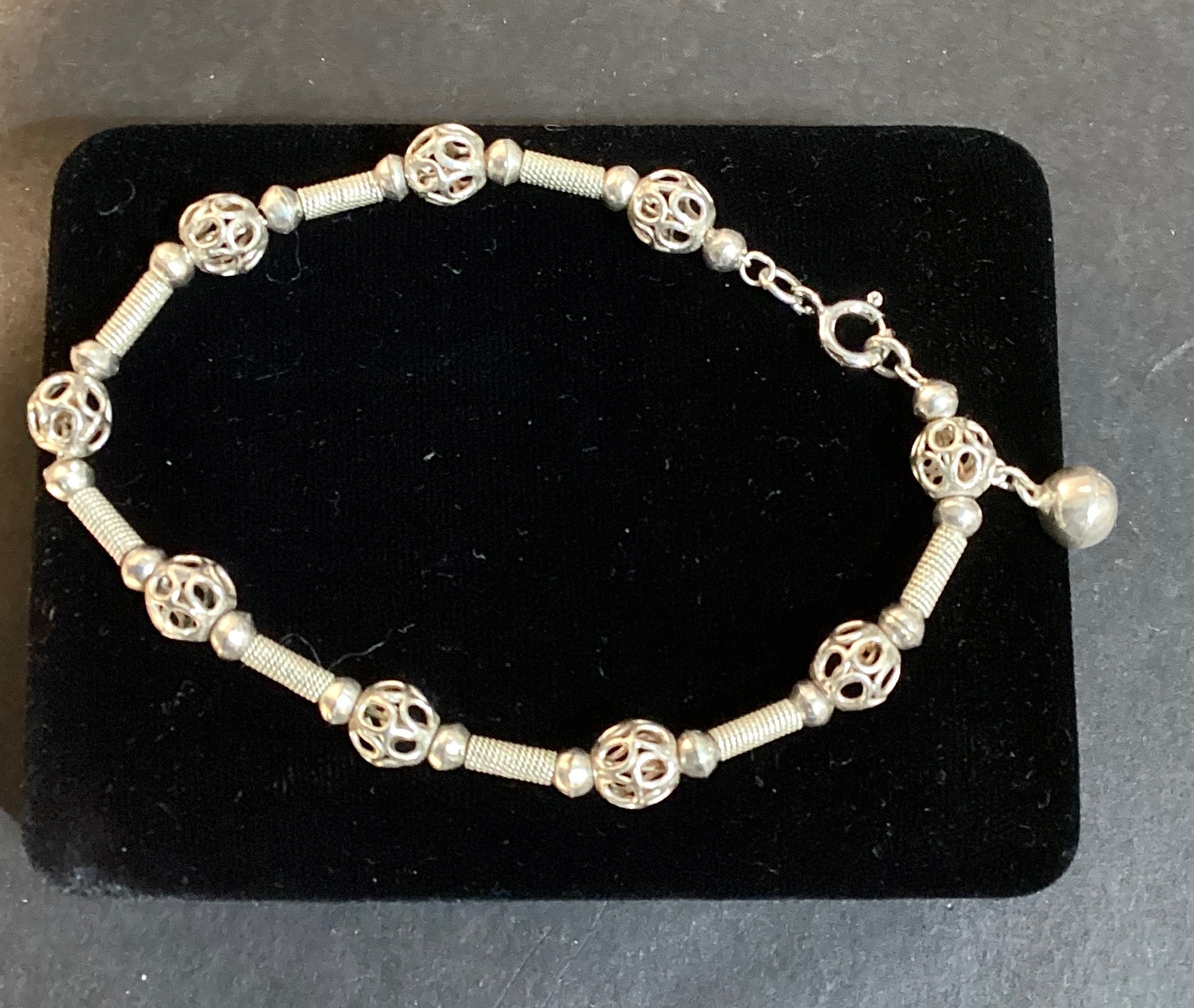 * a sterling silver bracelet with sterling silver findings in tube shape, open ball, a small silver ball spacers. Has a c -clasp closure. Measures for a 7 to 7.5”wrist.