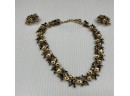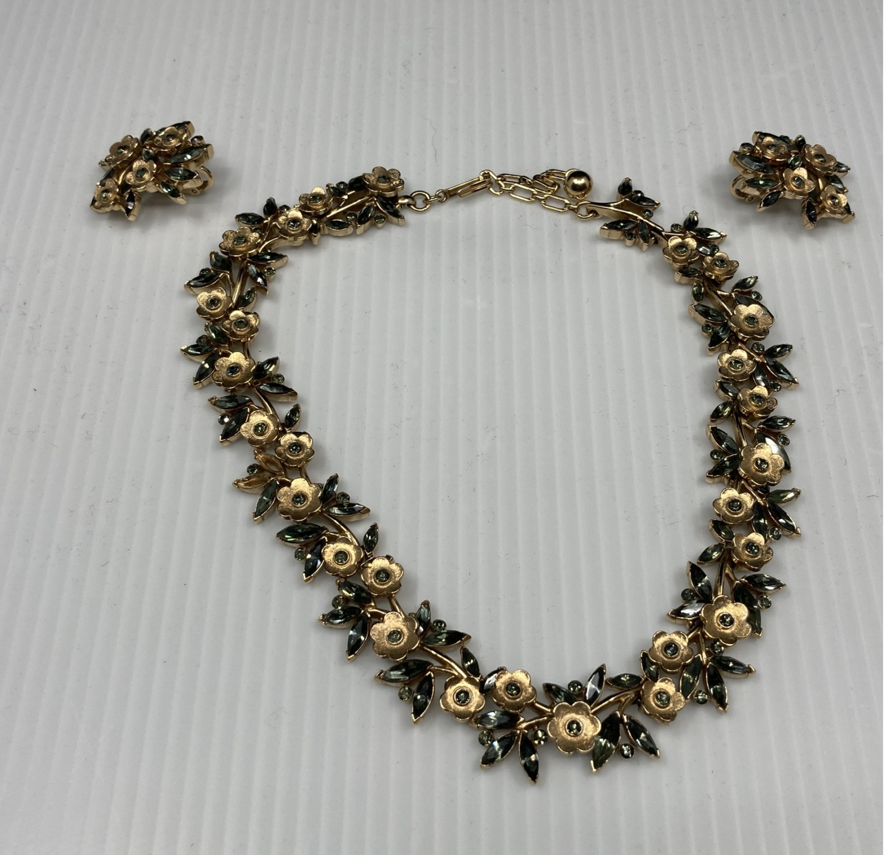 Selling a vintage gold plated necklace and clip-on earring set by Trifari featuring green rhinestone floral design.