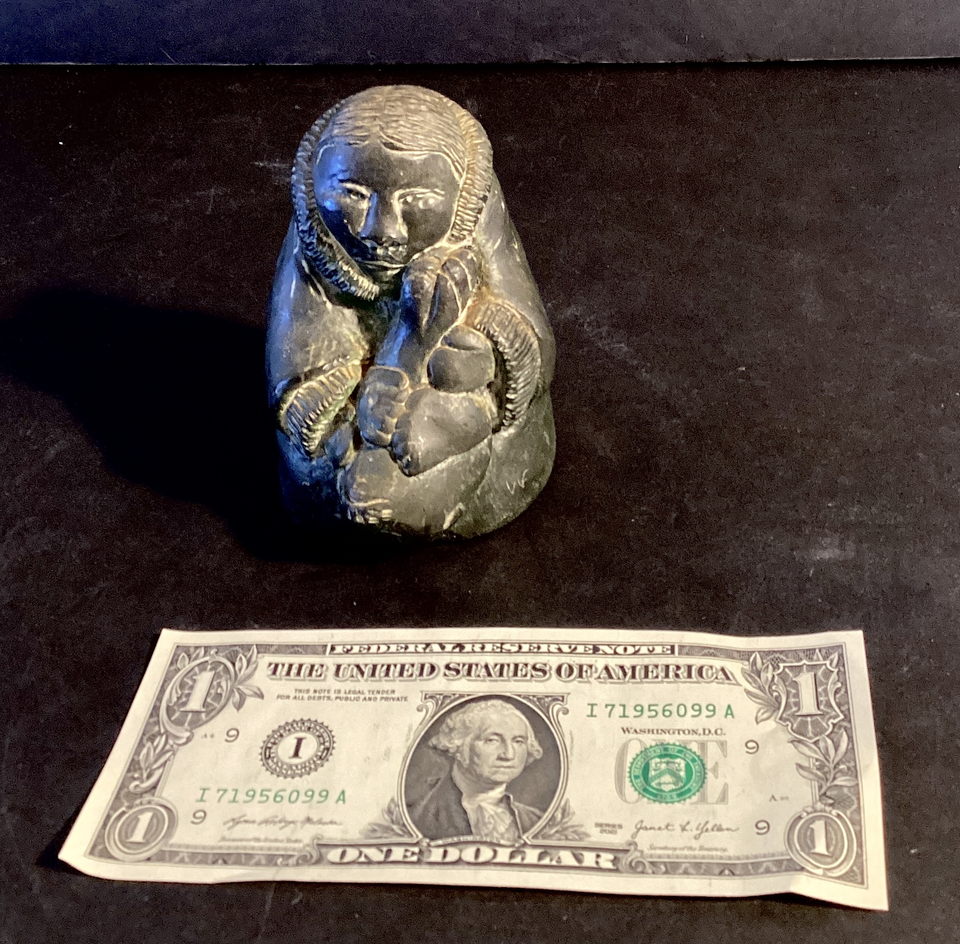This piece is a cast of an original soapstone figure. This has been made with a plaster like compound with a topcoat to give gloss and hardness.