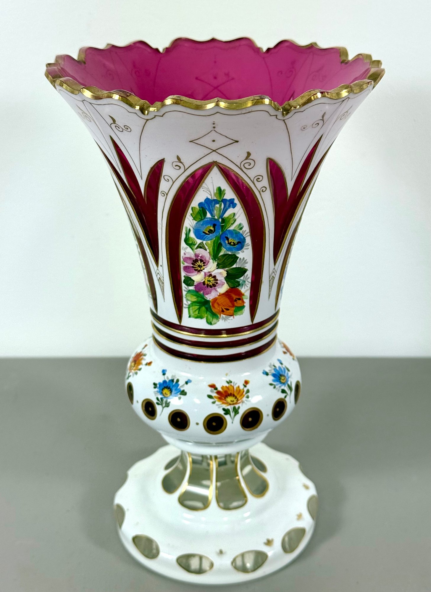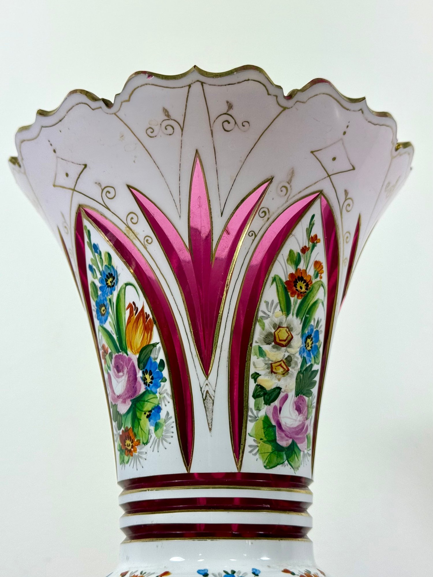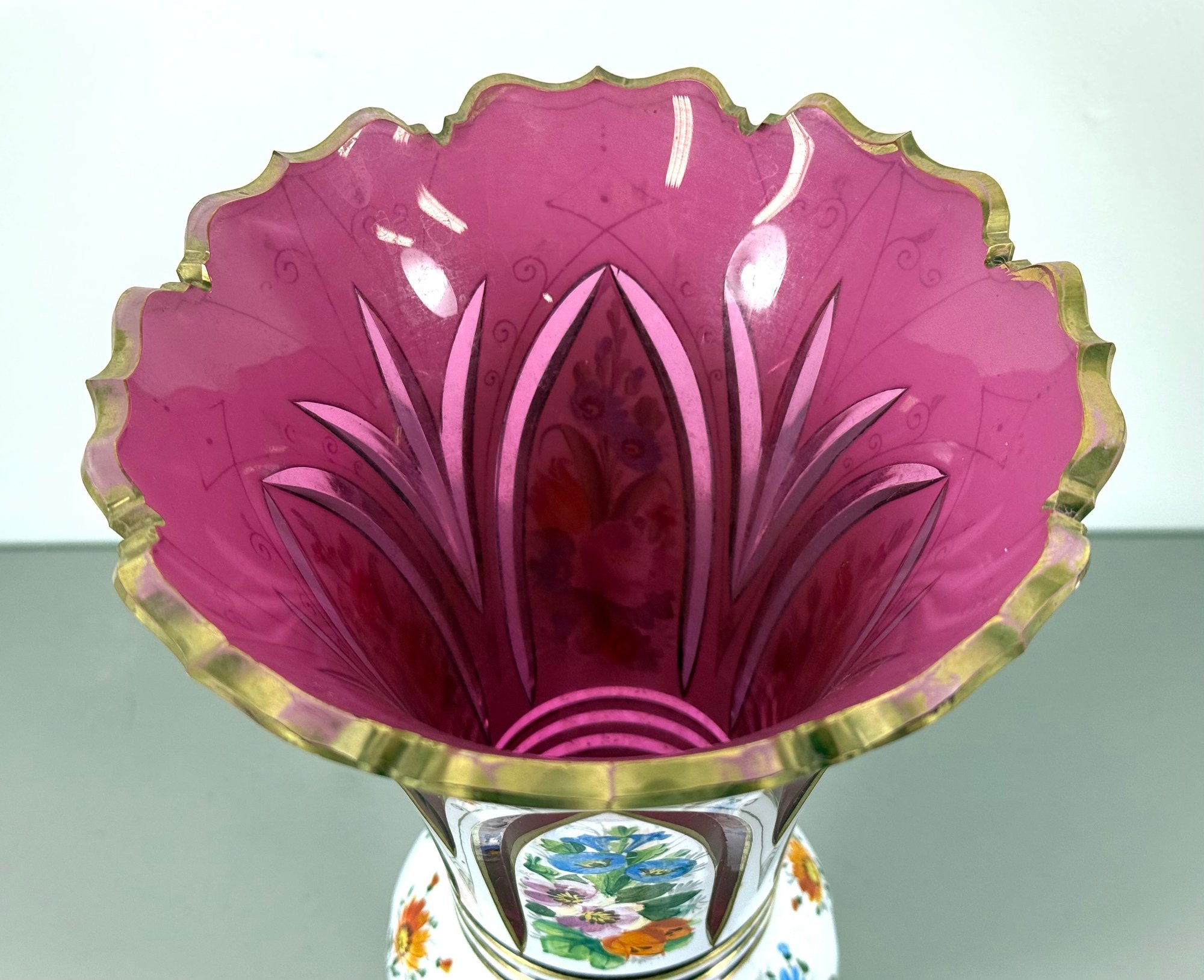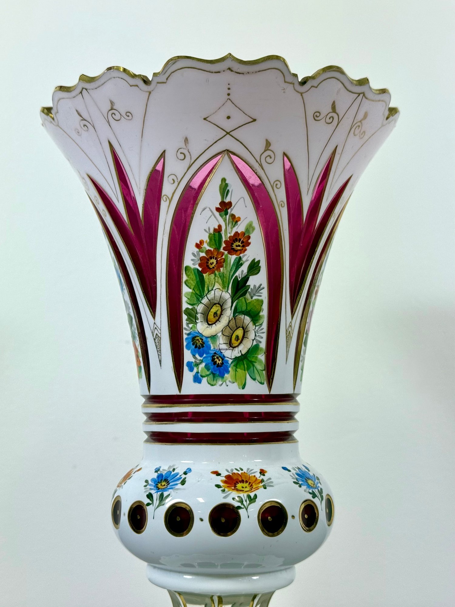 19th C. Cut to Clear/Cranberry Enamel Overlay Vase