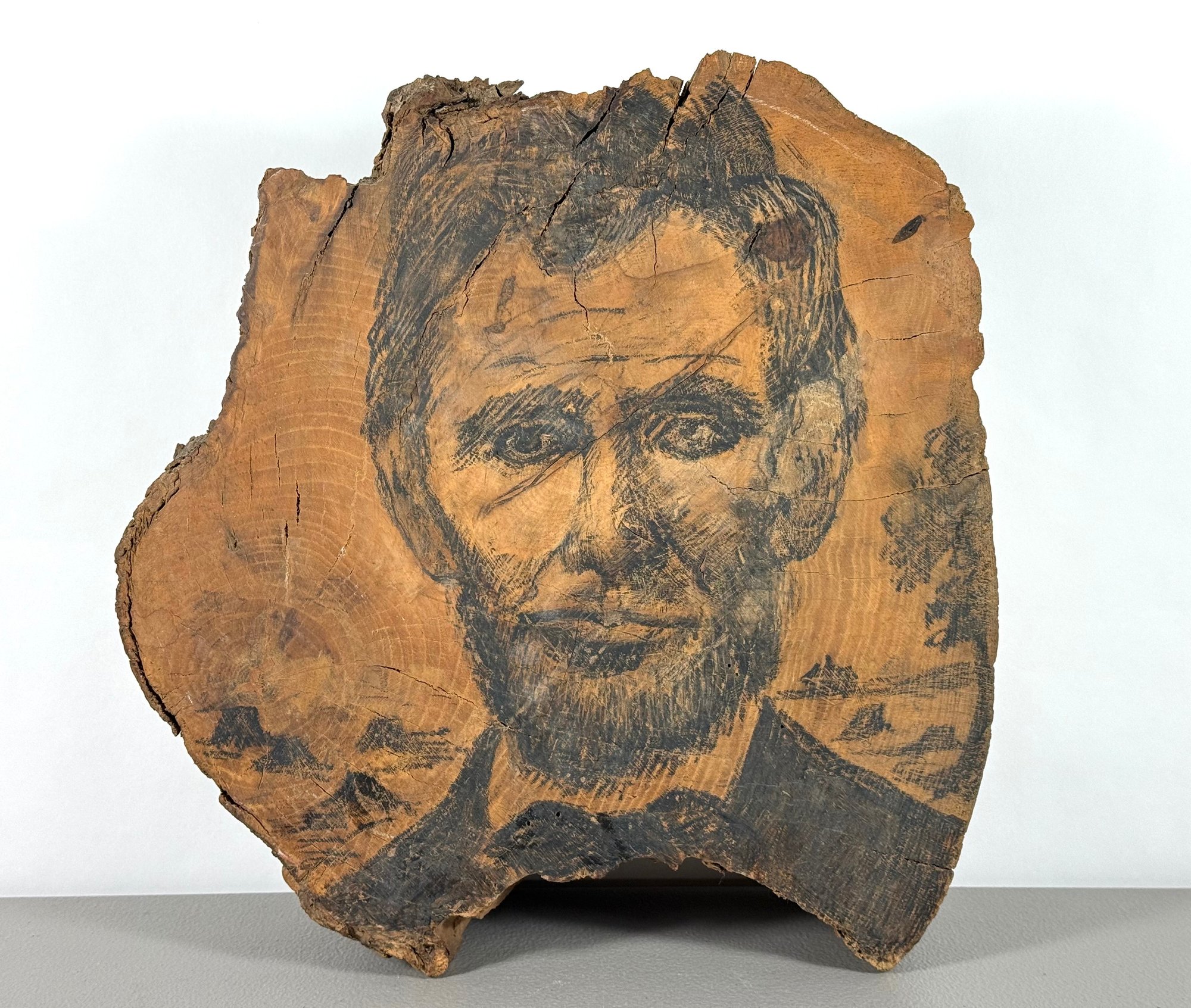 A truly amazing piece, hand drawn on a hefty chunk of old growth wood is a portrait of 16th US President Abraham Lincoln.