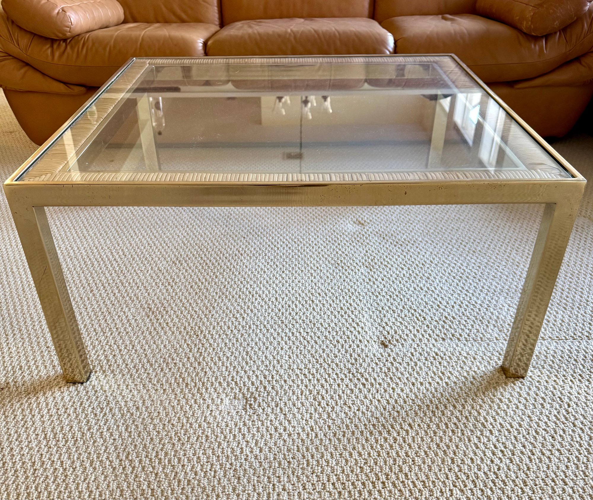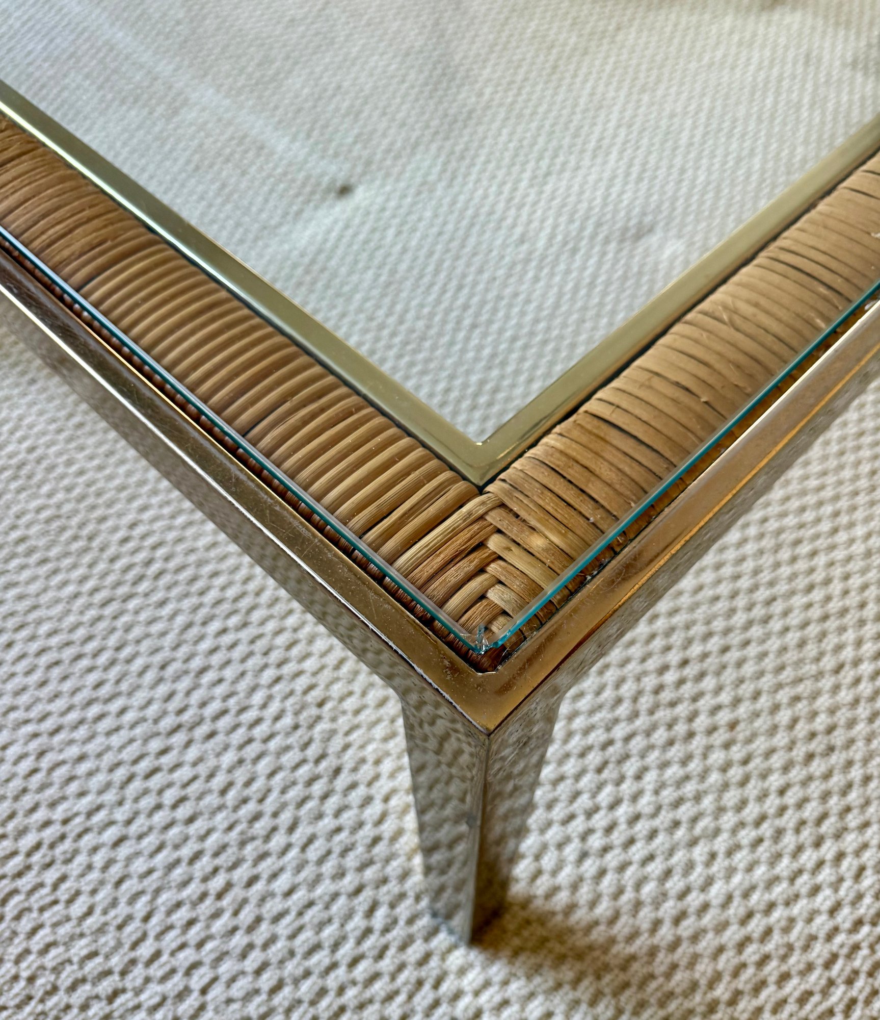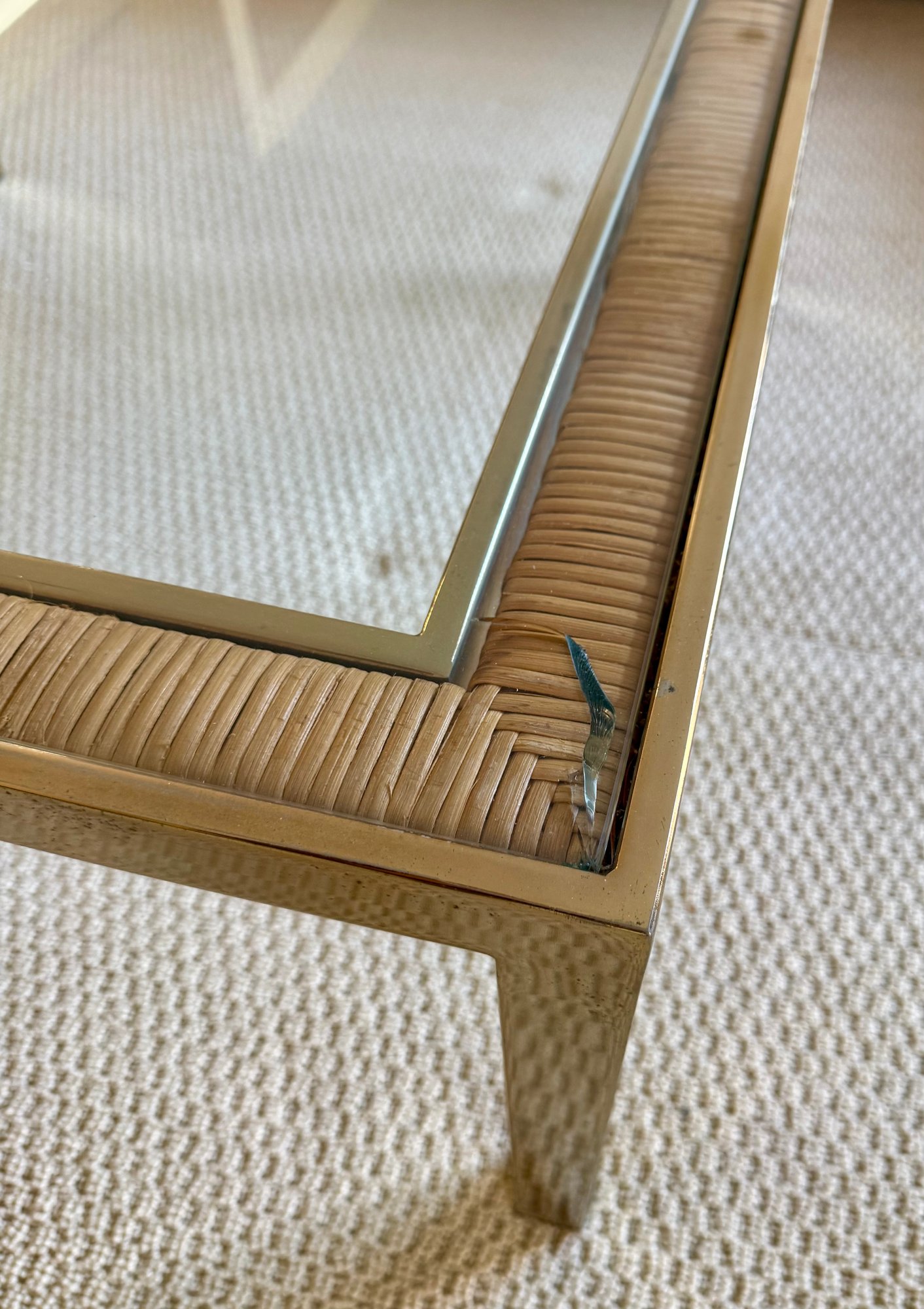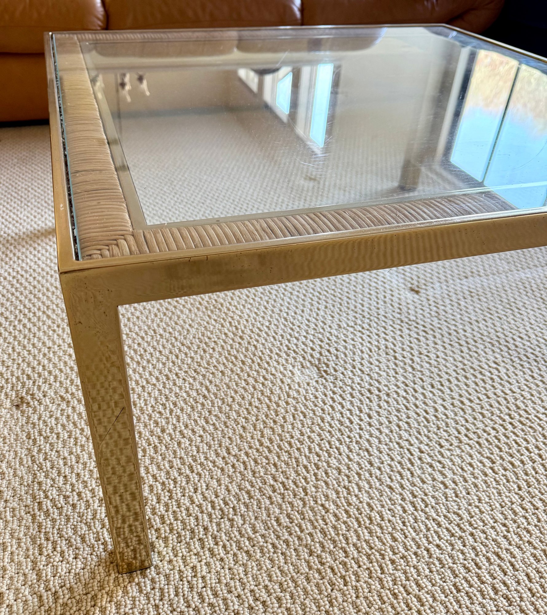 Mid-Century Glass Top Rattan & Brass Coffee Table