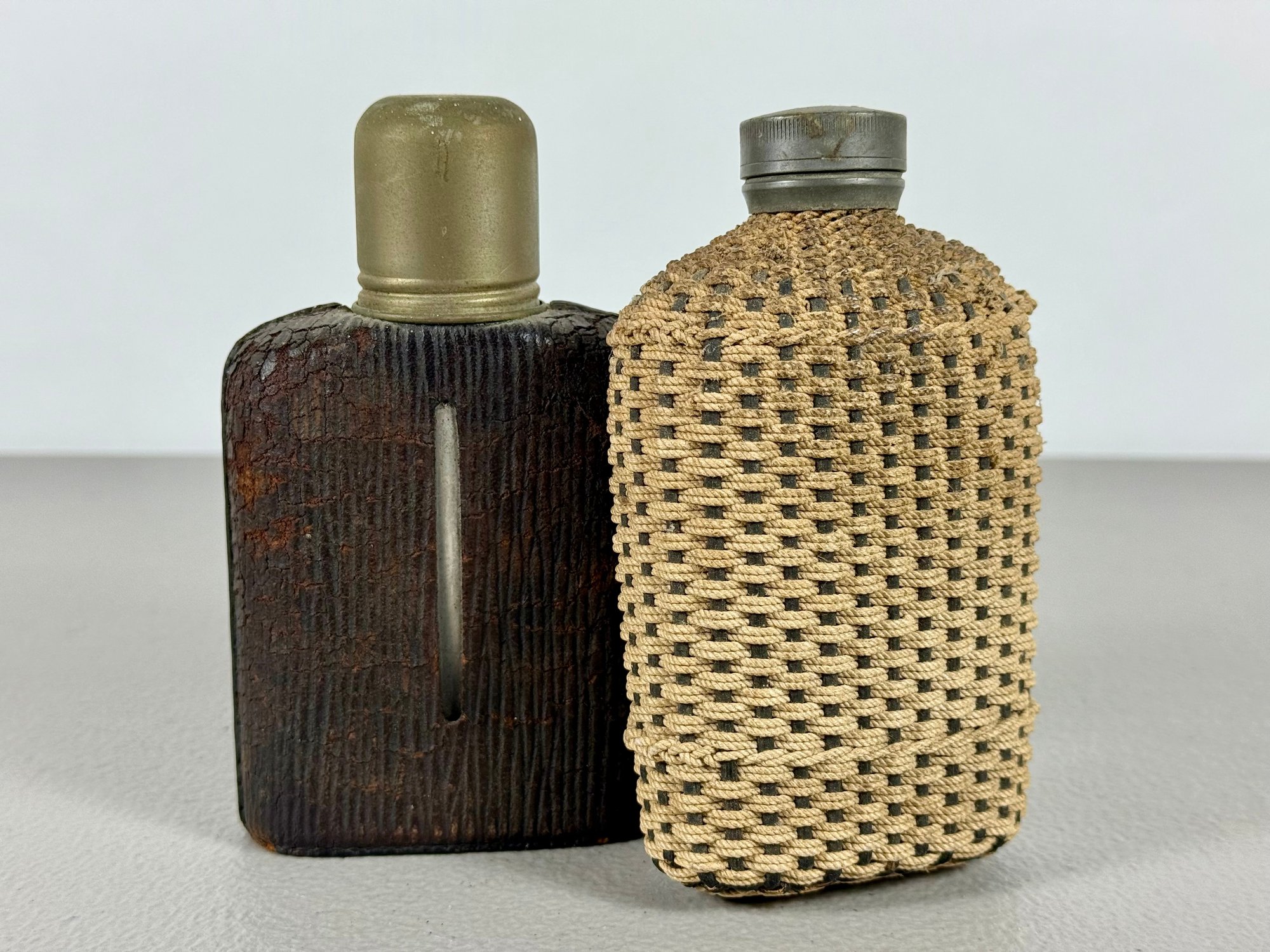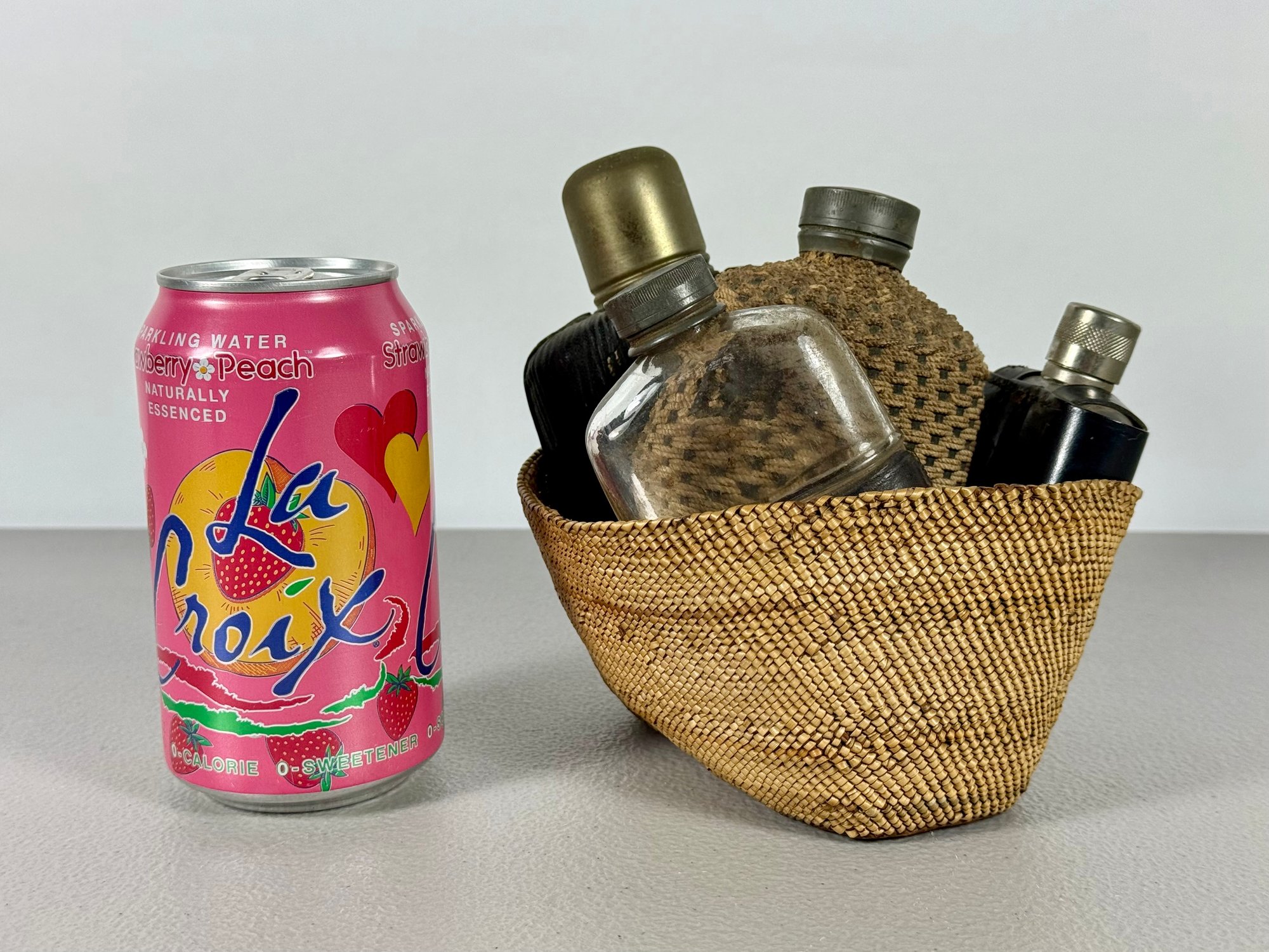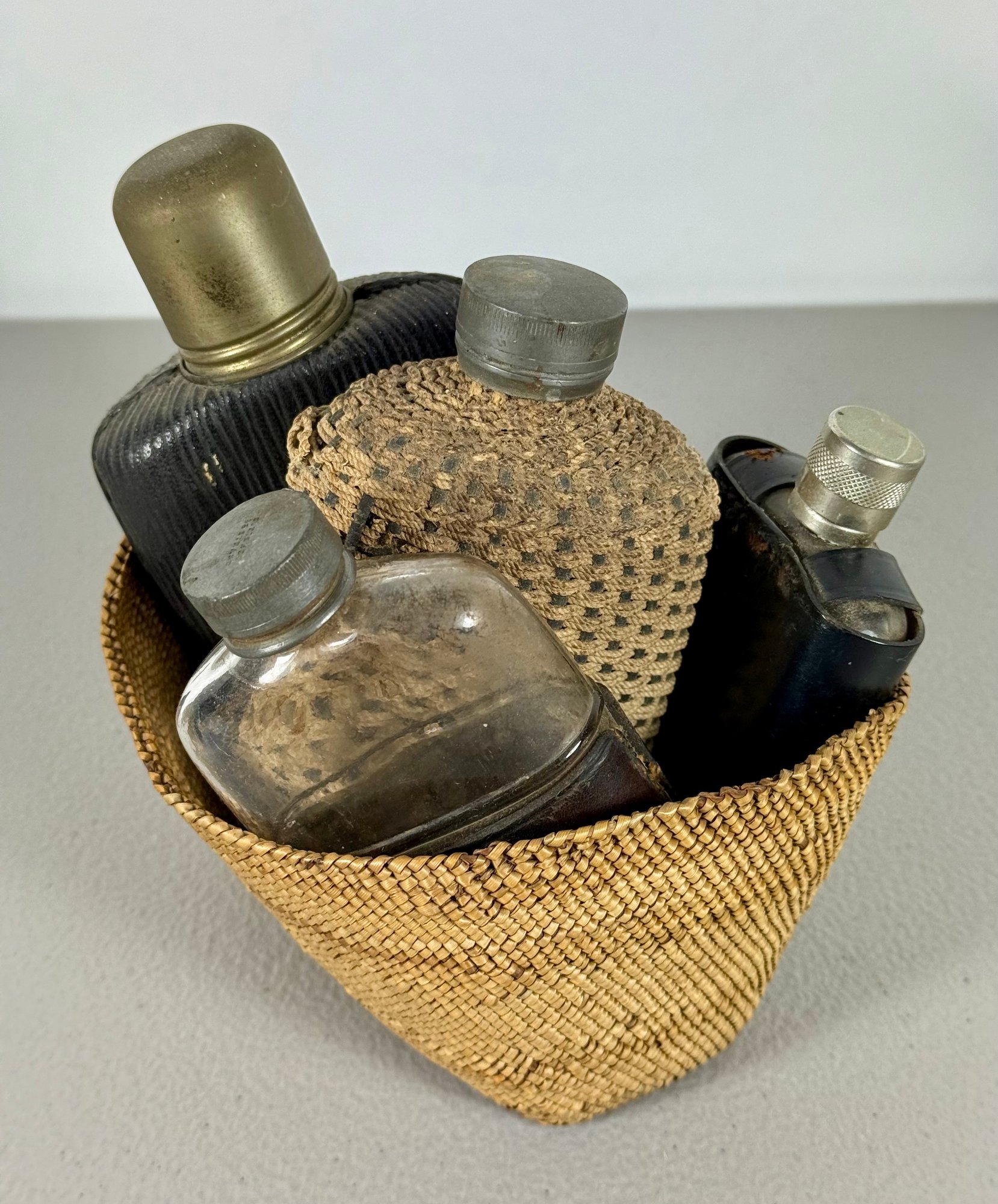 Grouping of (4) Antique Flasks & Woven Basket