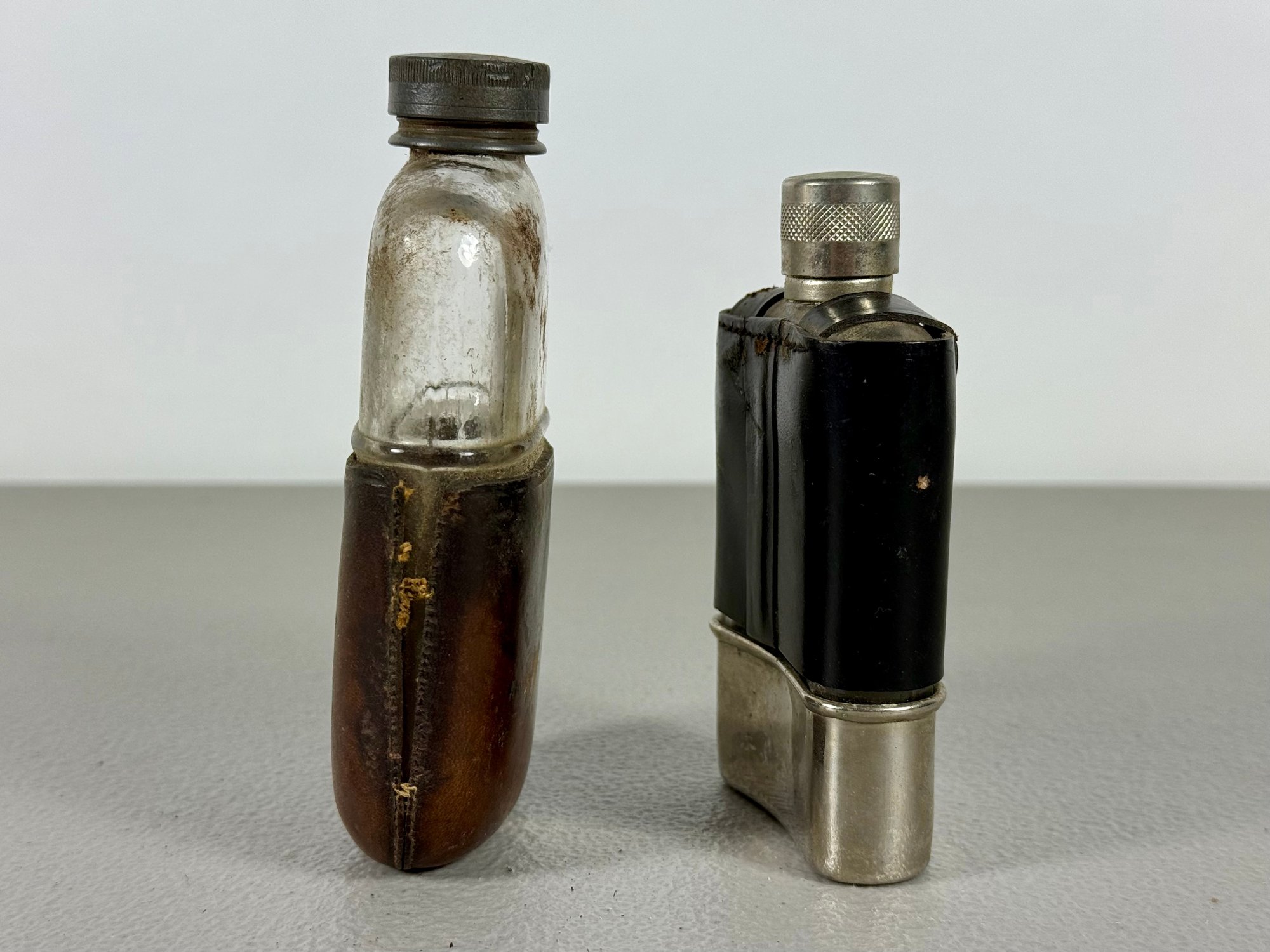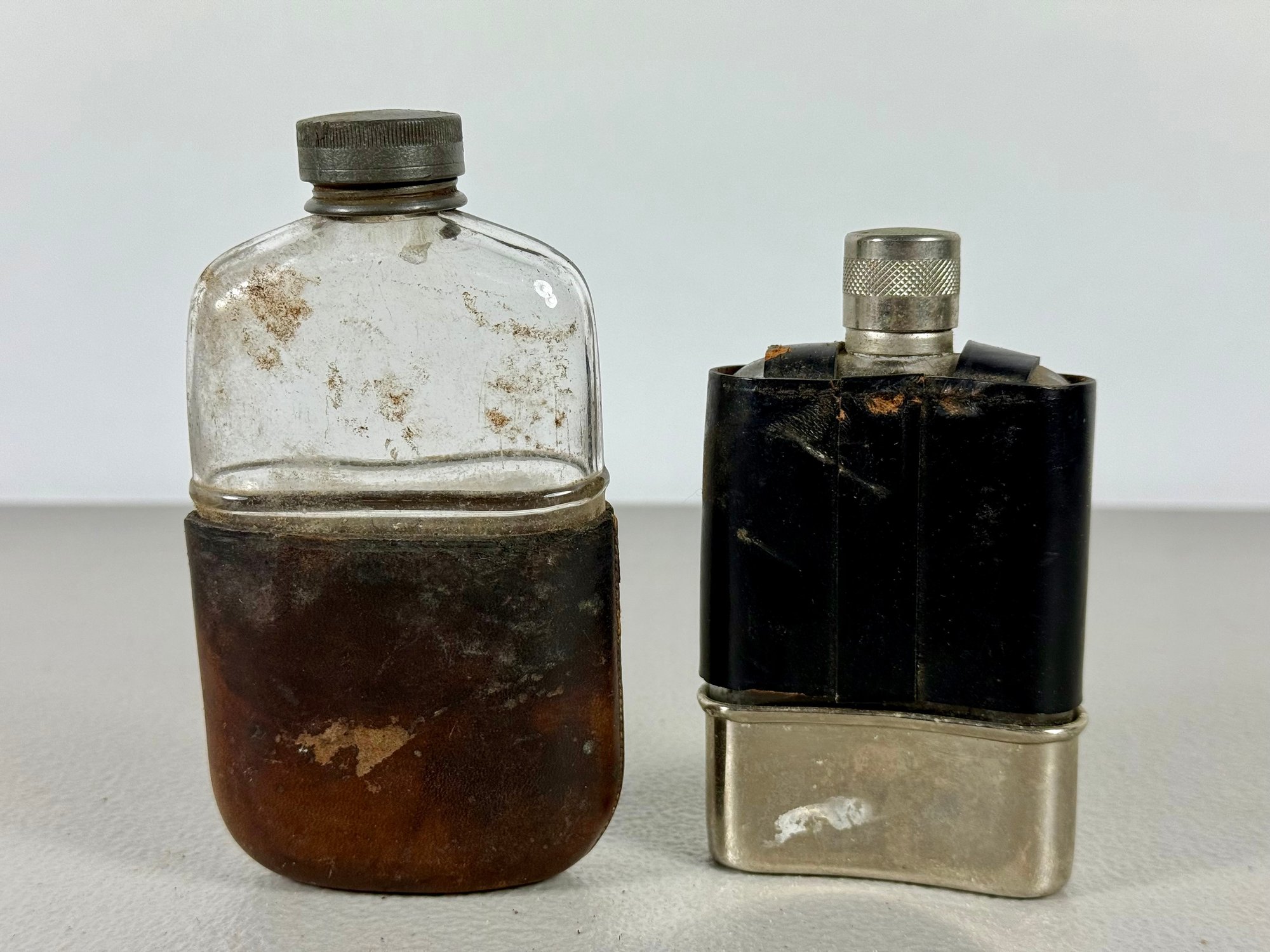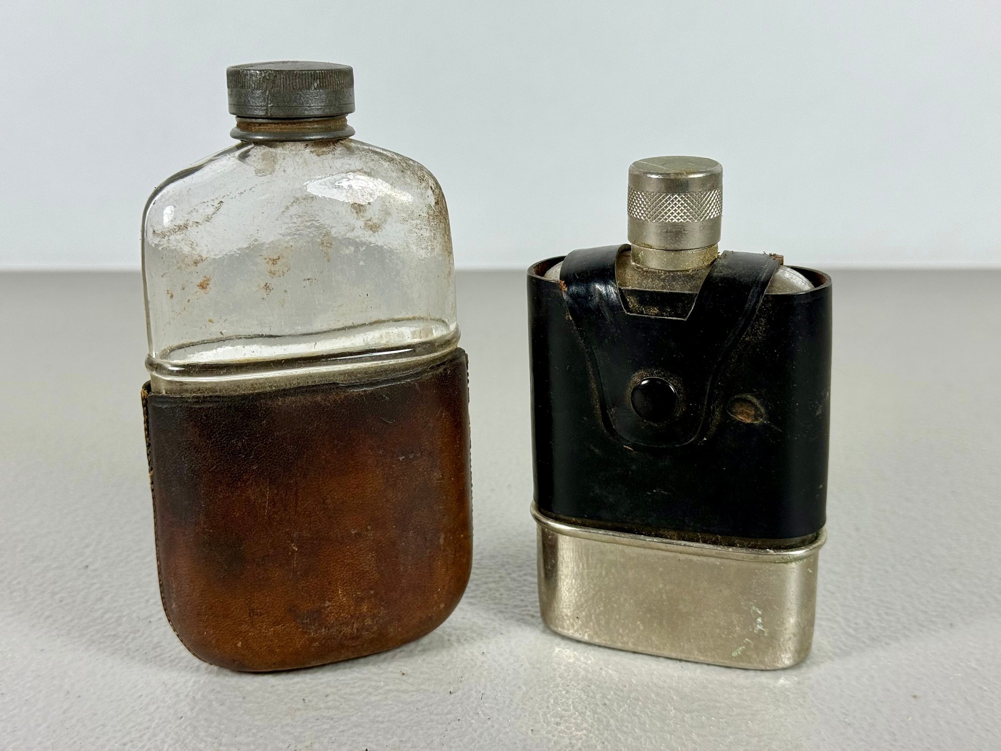 Grouping of (4) Antique Flasks & Woven Basket
