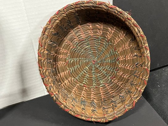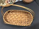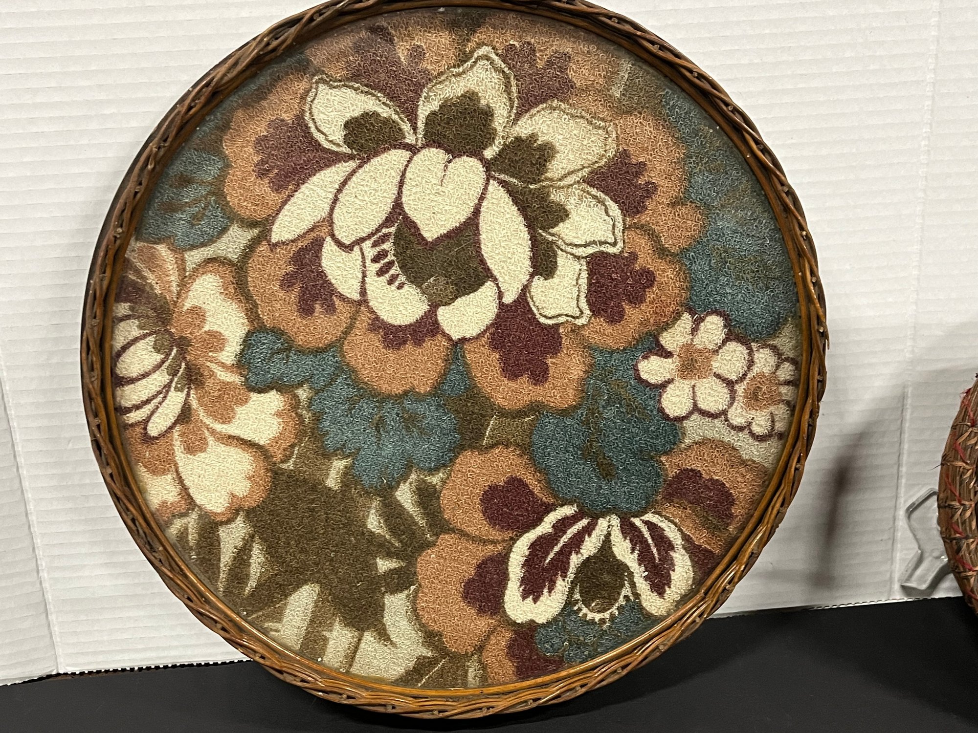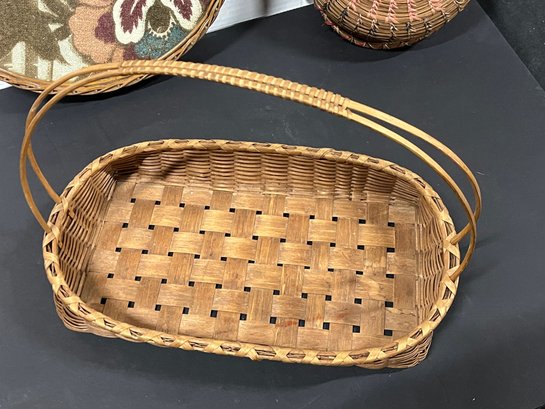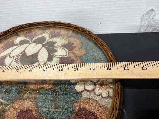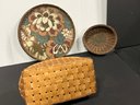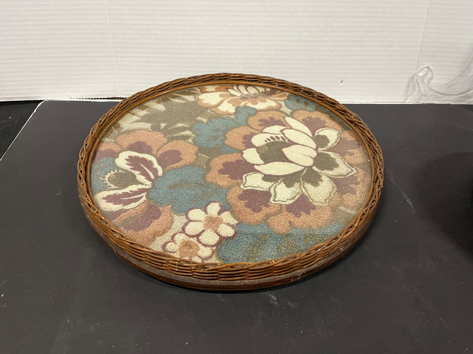 Asst Of Basketry Ware Pieces Incl Round Glass Top Tray With Material Floral Design