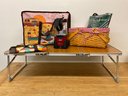 Camping Essentials - Two New Small Folding Tables, Lantern, Grill Cover And Basket