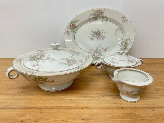 Oval platter, lidded vegetable dish, creamer and sugar bowl. Matches place settings.