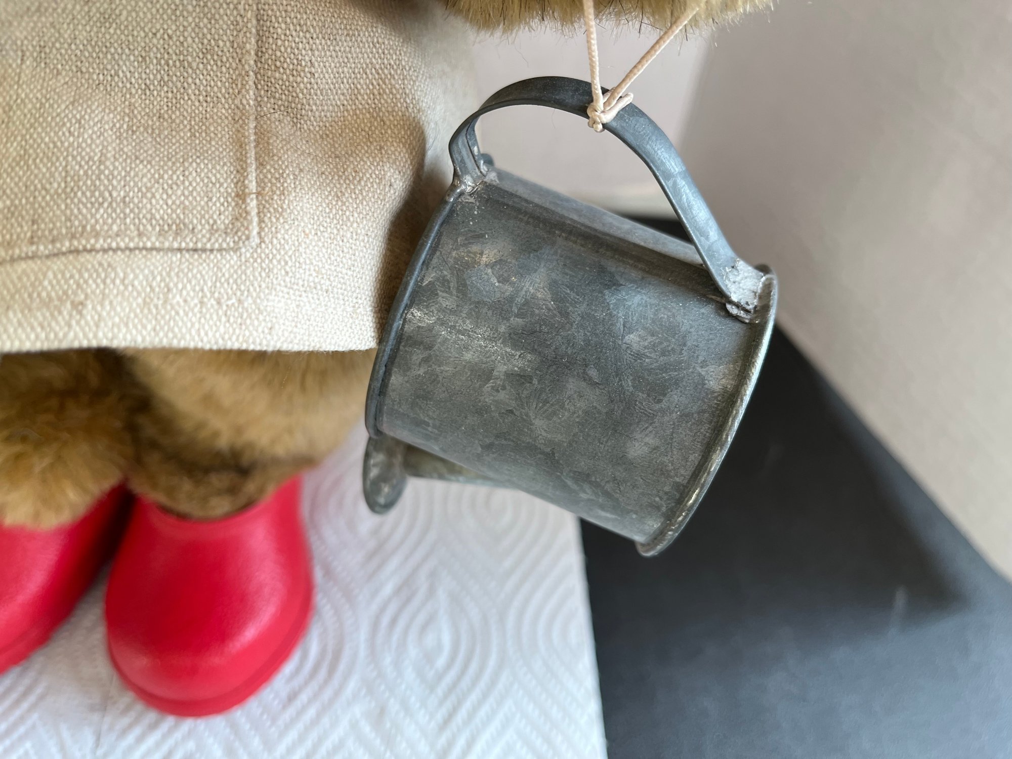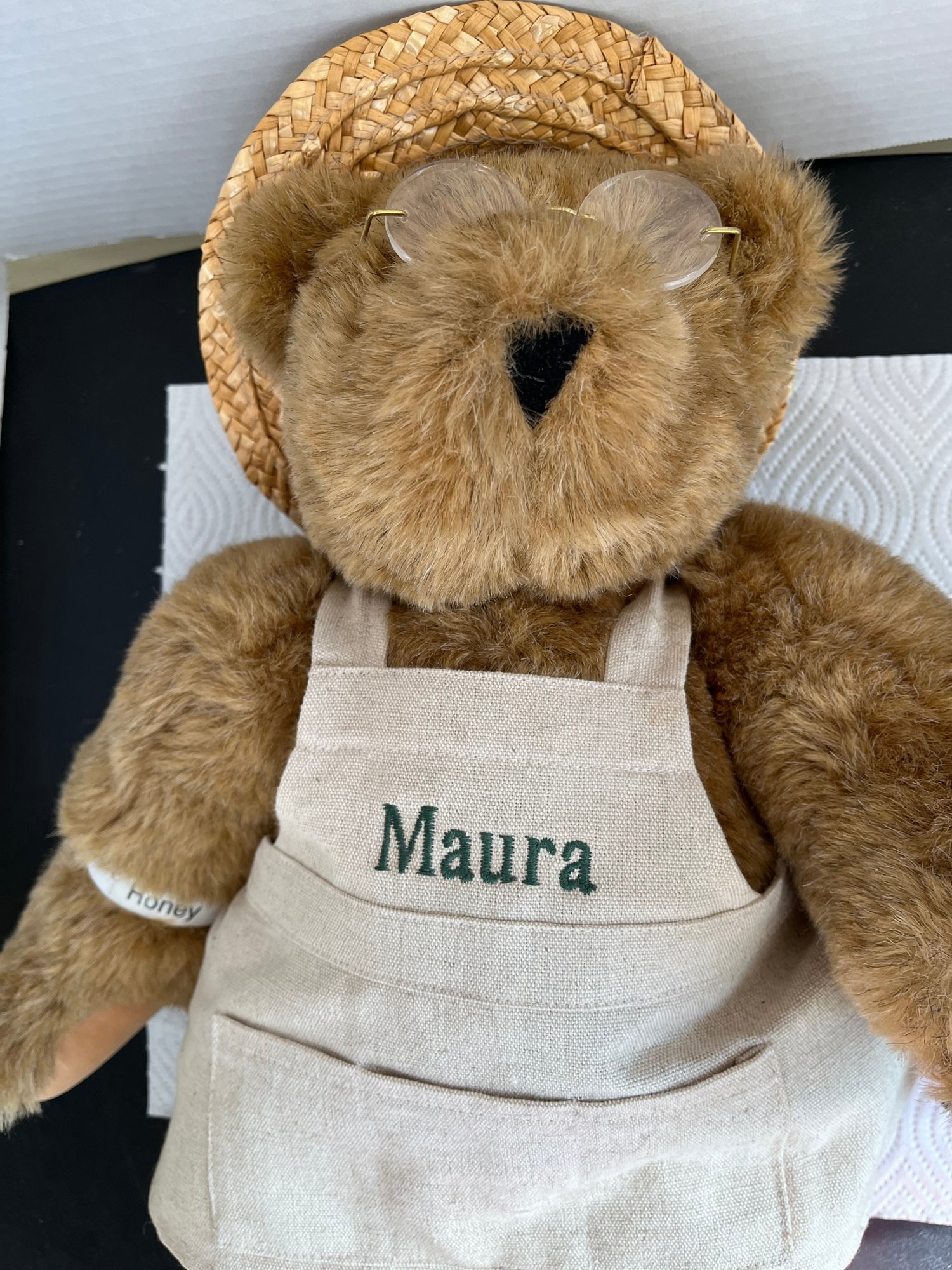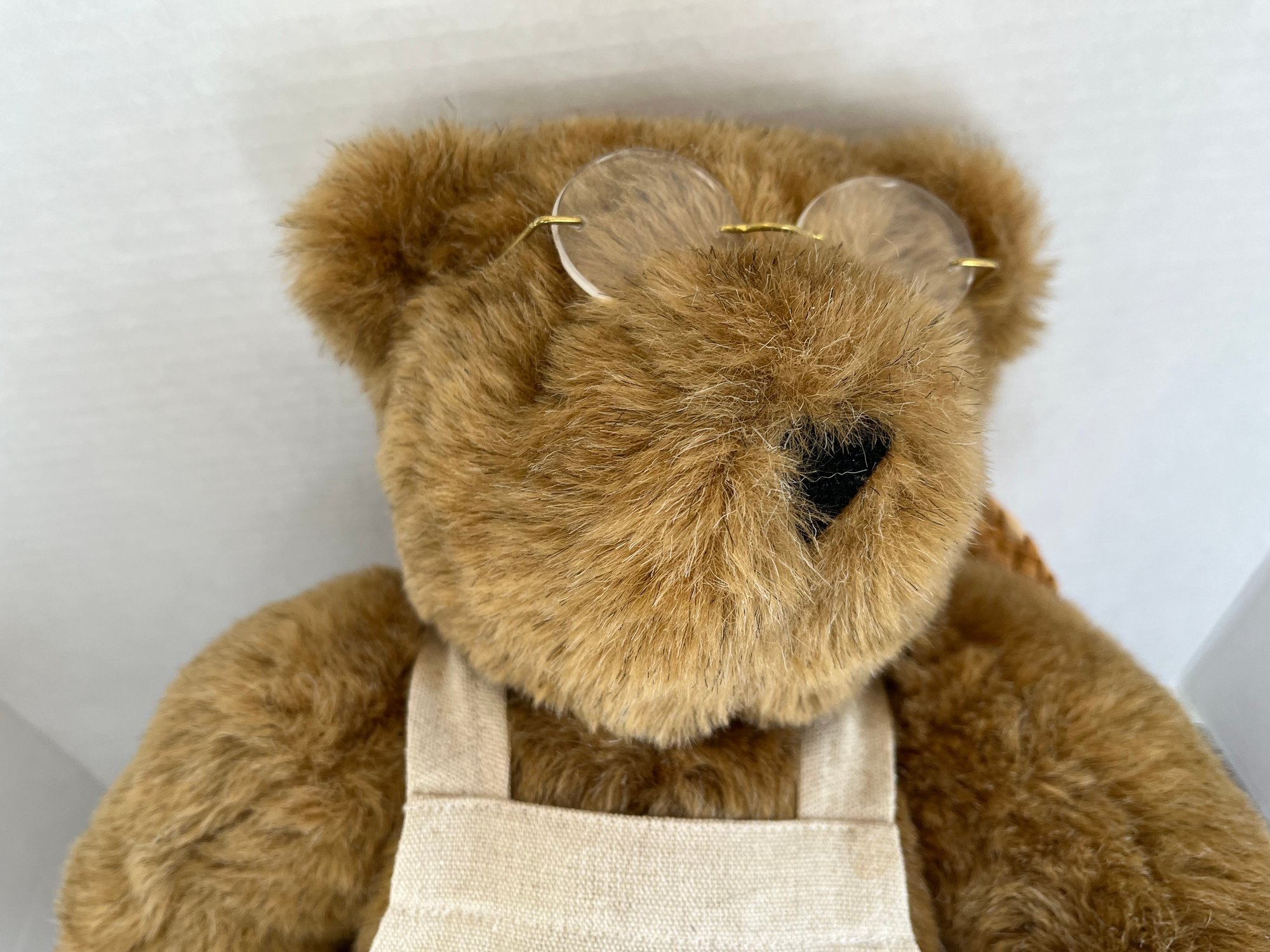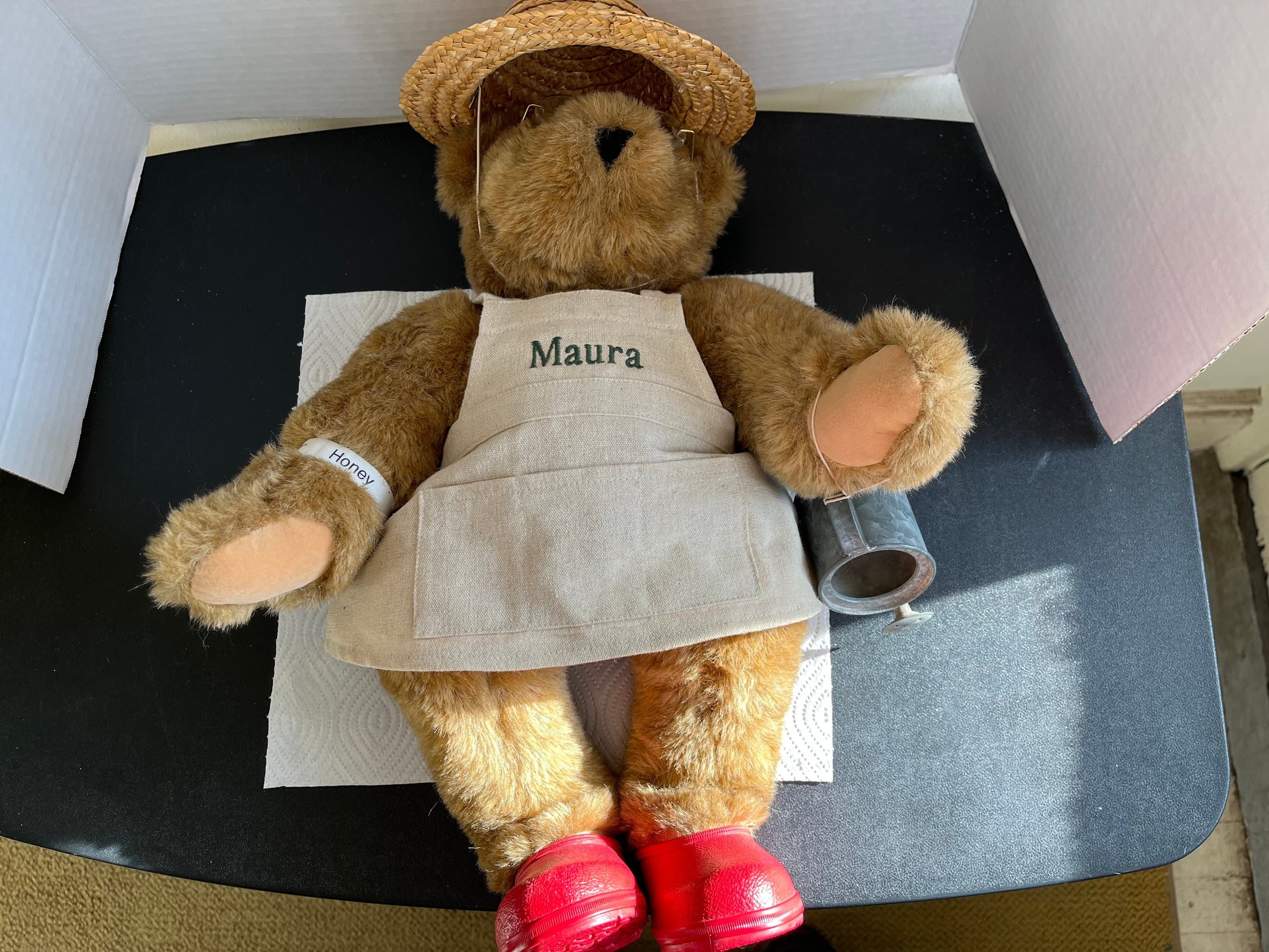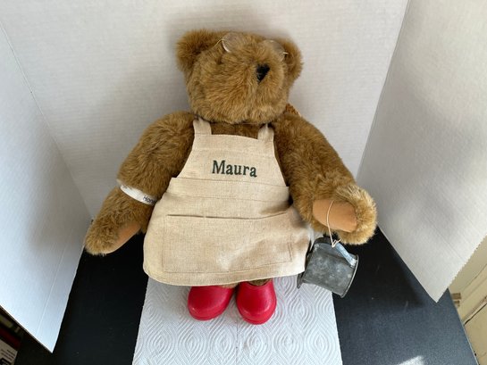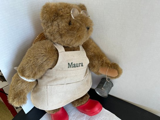 Complete with straw hat / eyeglasses / canvas gardening apron/ watering can / red work shoes and Vermont Teddy Bear hospital wrist tag