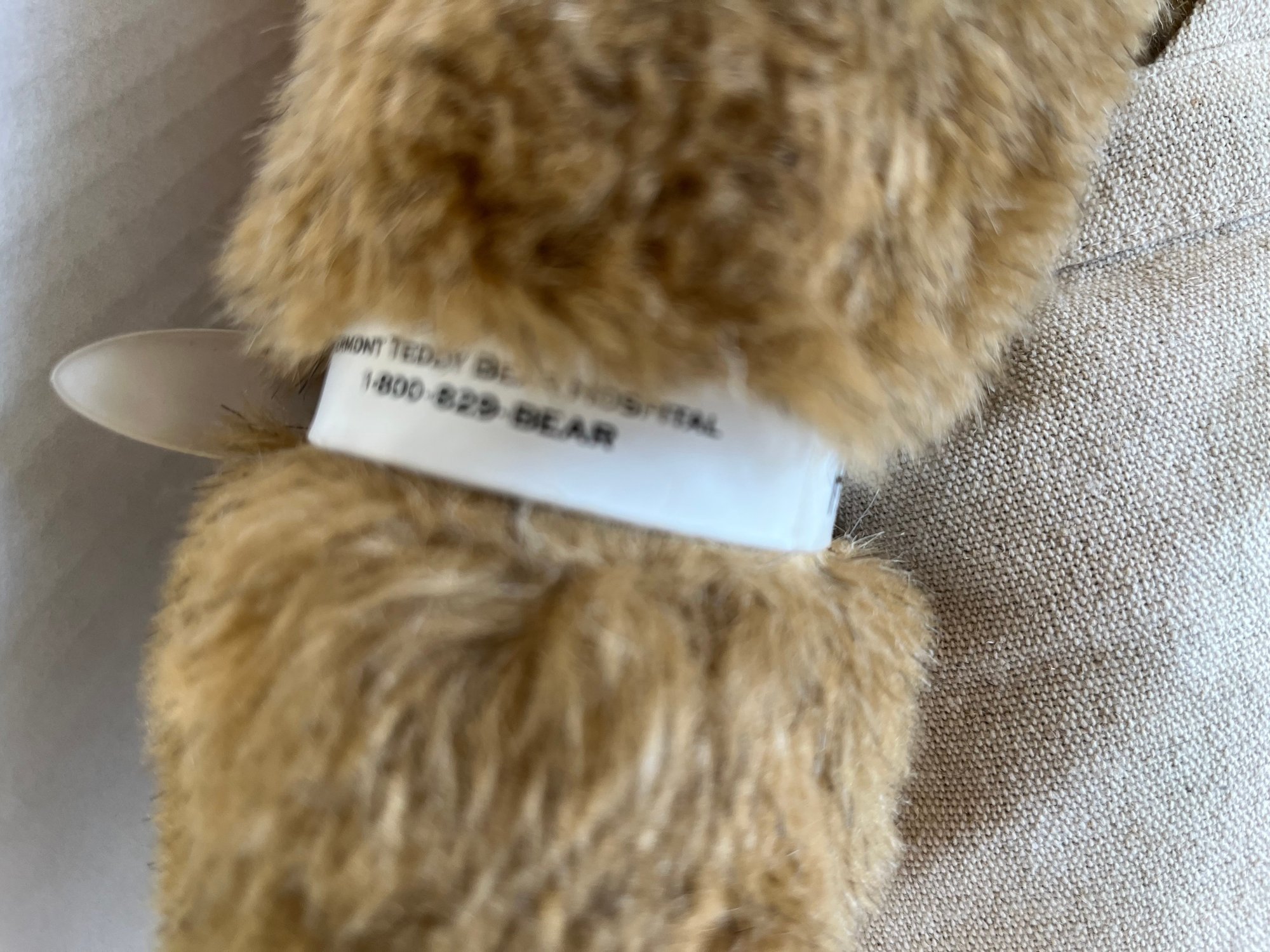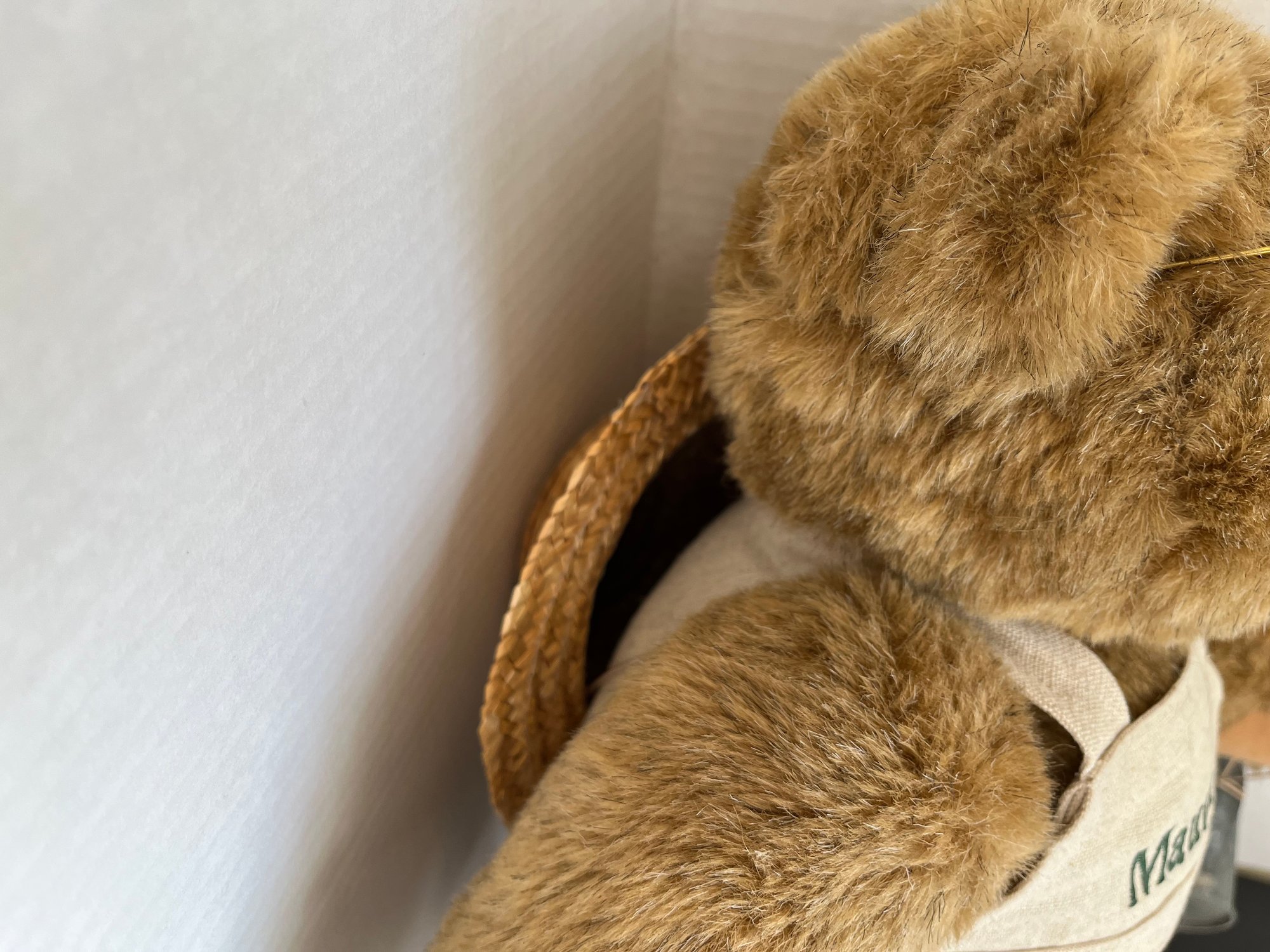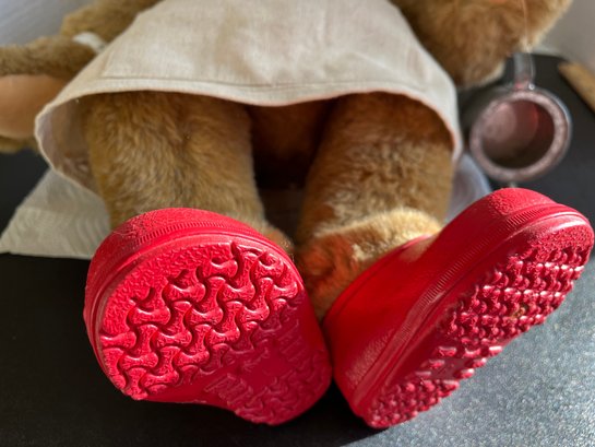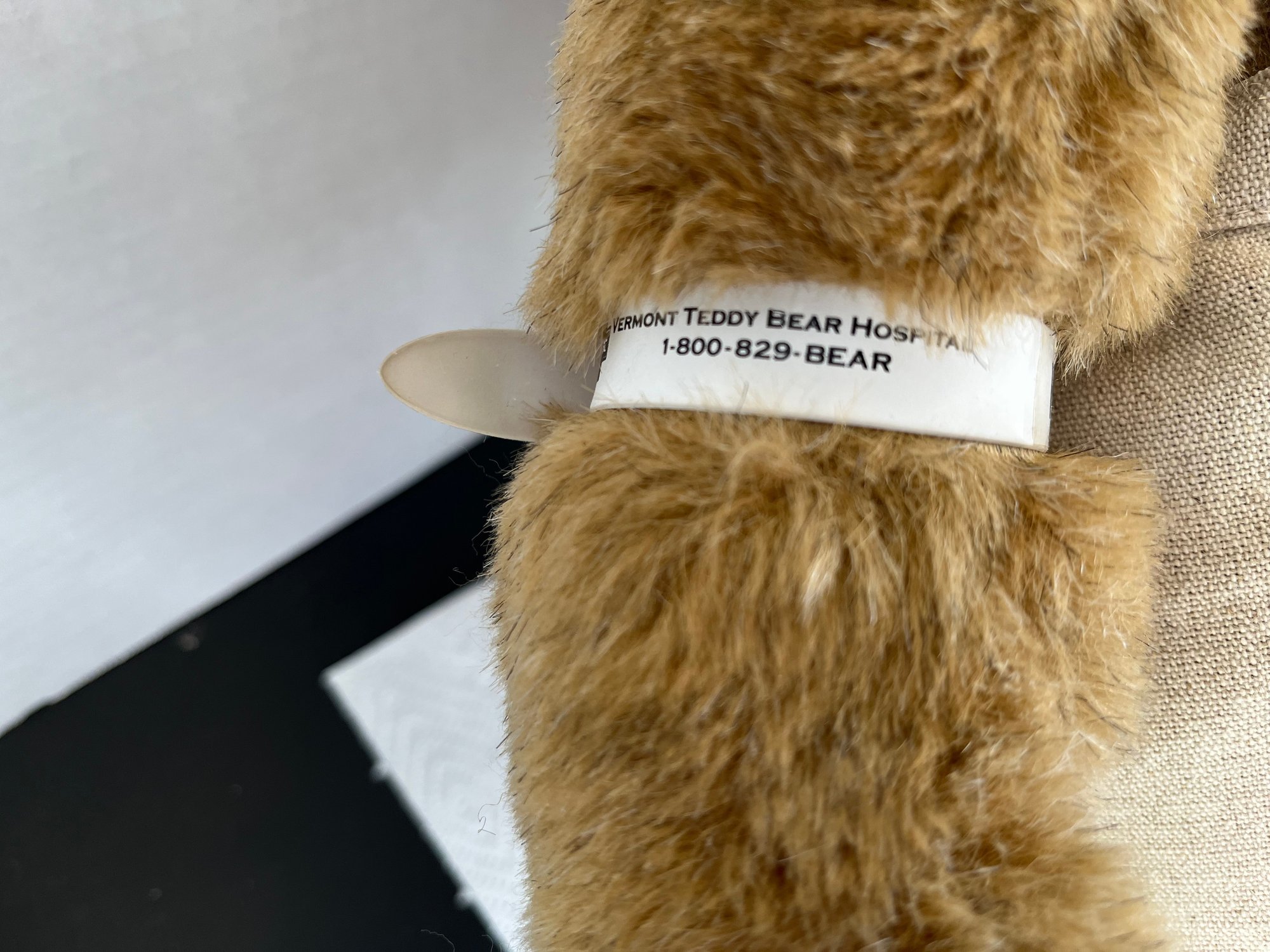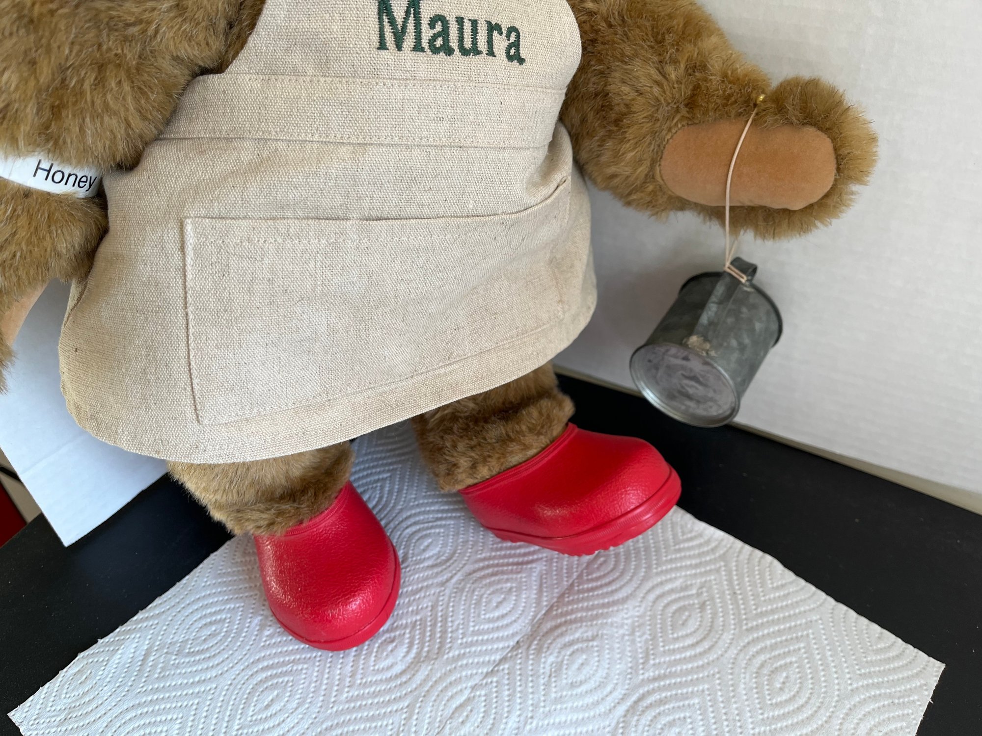 Complete with straw hat / eyeglasses / canvas gardening apron/ watering can / red work shoes and Vermont Teddy Bear hospital wrist tag