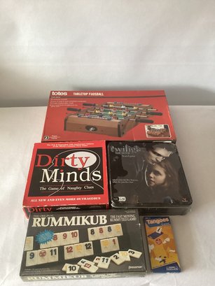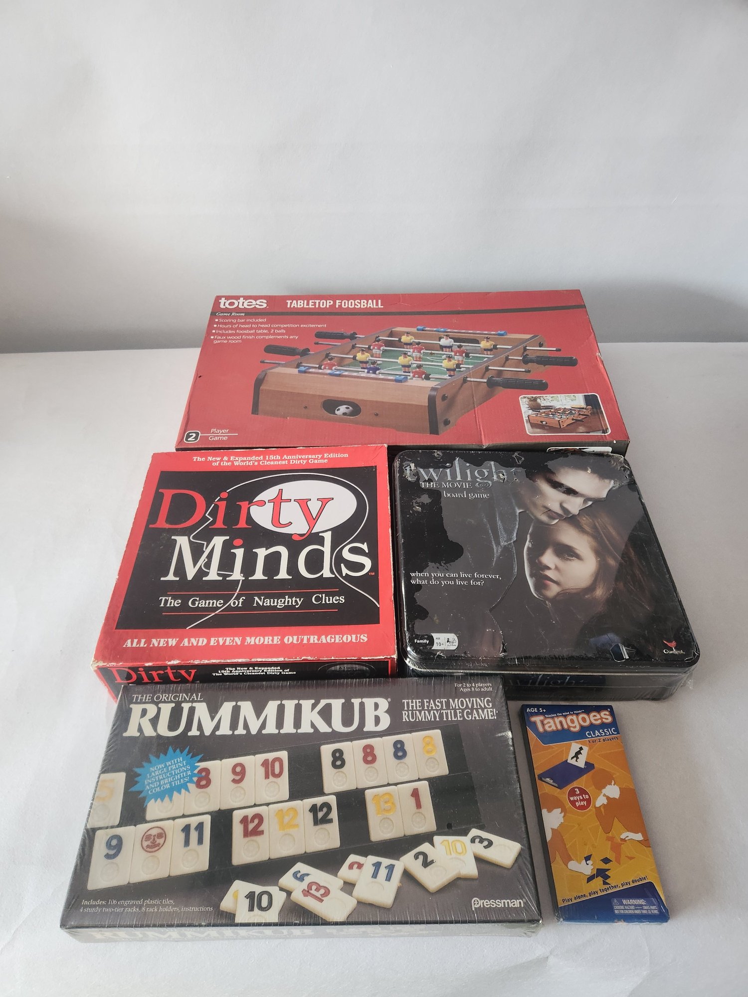 Notes: Totes Tabletop Foosball - open box, appears to be in tact and still in plastic Twilight The Movie Board Game - plastic seal torn, tin box has some dents but appears unopened Dirty Minds - The Game of Naughty Clues - as found, box shows wear, may be missing pieces Rummikub - Rummy Tile Game - sealed but box shows some wear Tangoes Classic - sealed but plastic and box show some wear
